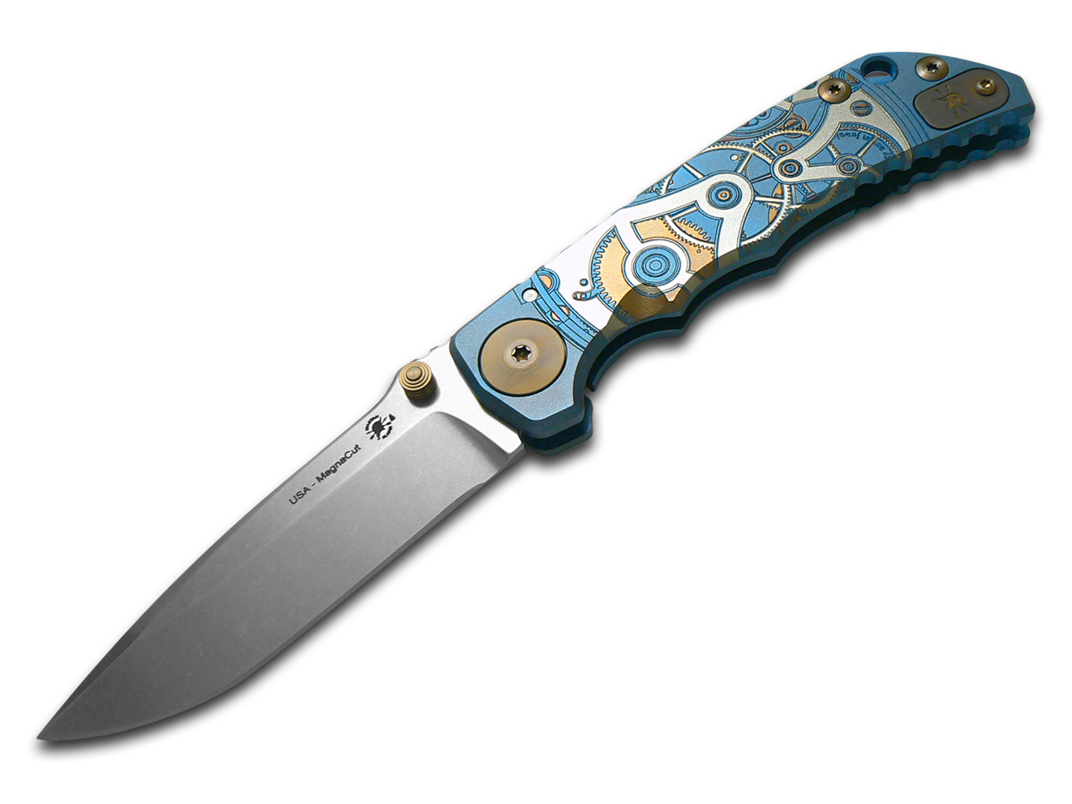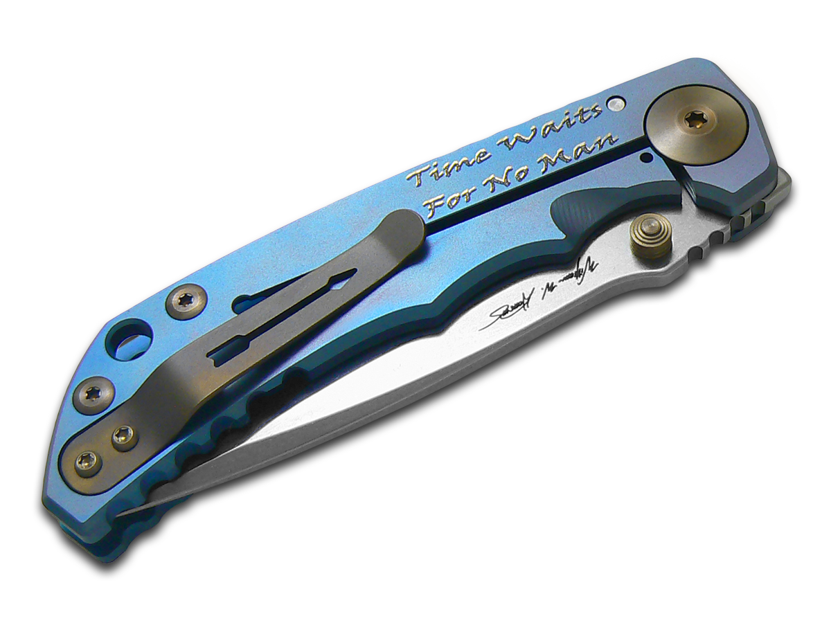 This Spartan Blades, LLC Harsey Folder Frame Lock knife utilizes a 4" Locking Drop Point blade with a plain edge, flat grind, swedge, 3.8mm thickness, thumb studs, and thumb ramp jimping. The blade material is 'Double Deep' Cryo-treated CPM MagnaCut Stainless Steel (61-63 HRC) with a Stonewashed finish and William W. Harsey signature. The contoured handle is Blue Anodized 6AL4V Titanium with jimping, lanyard hole, bronzed hardware, reversible tip-up pocket clip, and is engraved with golden Watch Works graphic on the front side and 'Time Waits For No Man' on the back side. It's around 4 3/4 inches long (folded/closed) and weighs approximately 5.9 ounces....