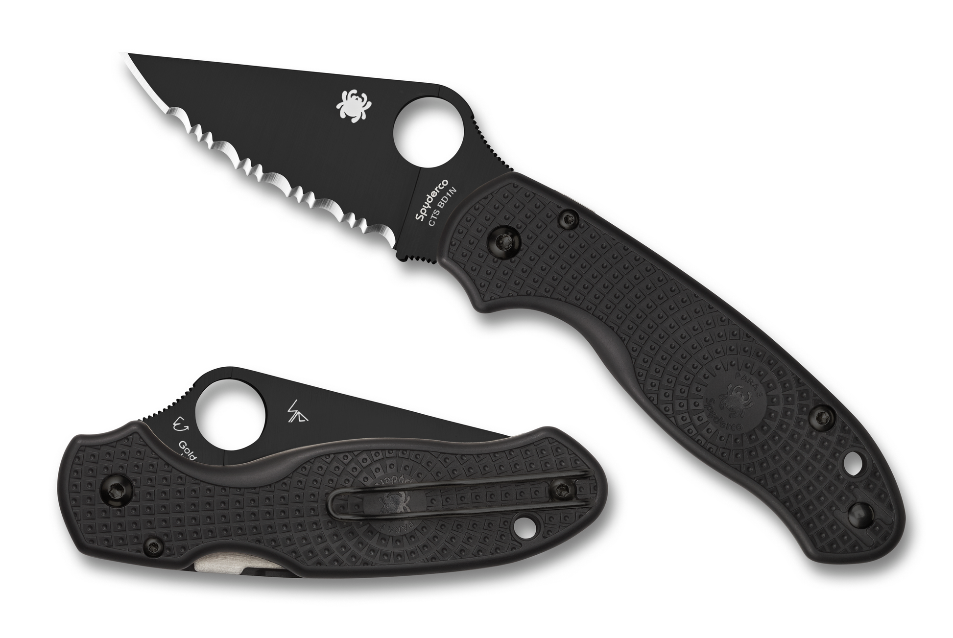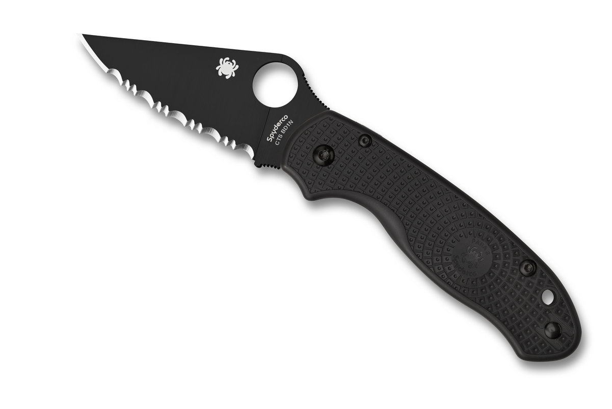 This Spyderco Knives Para 3 Compression Liner Lock knife utilizes a Serrated 3" Locking Drop Point(w/Thumb Hole) blade. The blade material is CTS BD1N Stainless Steel with Blackened DLC finish. The handle is Black Fiberglass-Reinforced Nylon with Non-Slip Bi-Directional Textured Grip, Reversible Wire Pocket Clip, and Lanyard Hole. It's around...