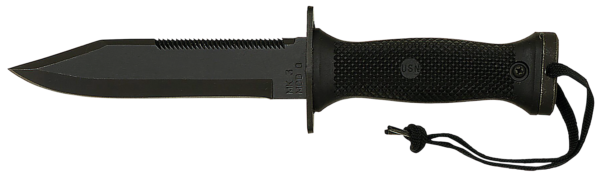 This Ontario Knives MOD Mark 3 Dive Fixed Blade knife utilizes a 6" Double-edged Clip-point blade with a sharpened swedge, saw-back spine and 4mm thickness. The blade material is 440A Stainless Steel with Black Oxide finish. The handle is textured, Black High-impact Plastic with lanyard hole, steel finger guard and steel hammer pommel. It's around 11 1/8 inches long (total) and weighs approximately 10.6 ounces. Handcrafted in the U.S.A., this knife comes complete with Limited Lifetime Manufacturer's Warranty, a Black High-impact Belt Sheath and Lanyards.