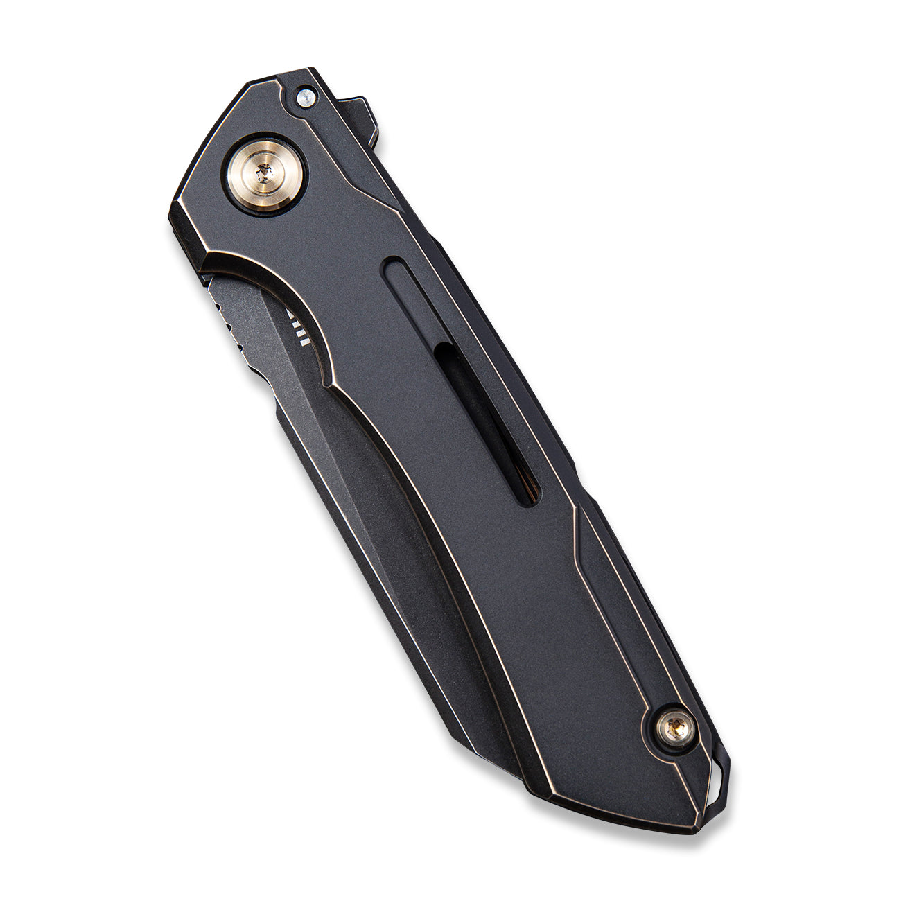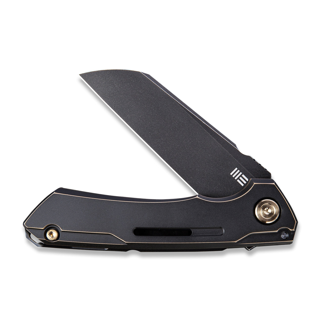This WE Knife Co., Ltd Mini Buster Frame Lock knife utilizes a 3 1/2" Locking Wharncliffe blade with a flat grind and a finger lever. The blade material is CPM 20CV Stainless Steel with a Black Stonewashed finish. The handle is Black 6AL4V Titanium with Antique Bronze finish, a lanyard hole and a right-carry, tip-up Titanium pocket clip. It's around 4 1/2 inches long (folded/closed) and weighs approximately 4.0 ounces. Handcrafted in China, this knife comes complete with Limited Lifetime Manufacturer's Warranty, Storage Pouch and Box.