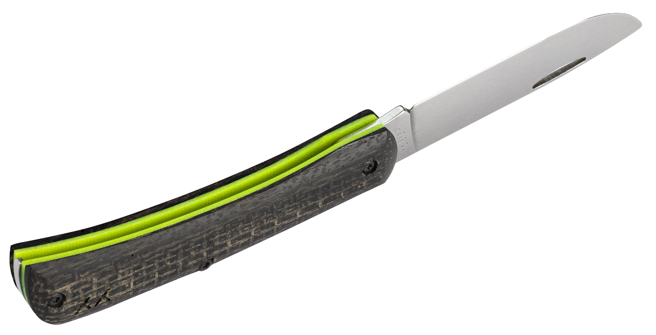 This W.R. Case & Sons Cutlery Co. Sodbuster Jr knife utilizes a 2 7/8" Skinner blade. Stamped with pattern number XR7137 S35VN, the blade material is CPM S35VN Stainless Steel with a Stonewashed finish. The handle is smooth Black Canvas Laminate & Day Glow G10 liners engraved with XX logo. It's around 3 3/4 inches long (folded/closed) and weighs approximately 2.0 ounces.