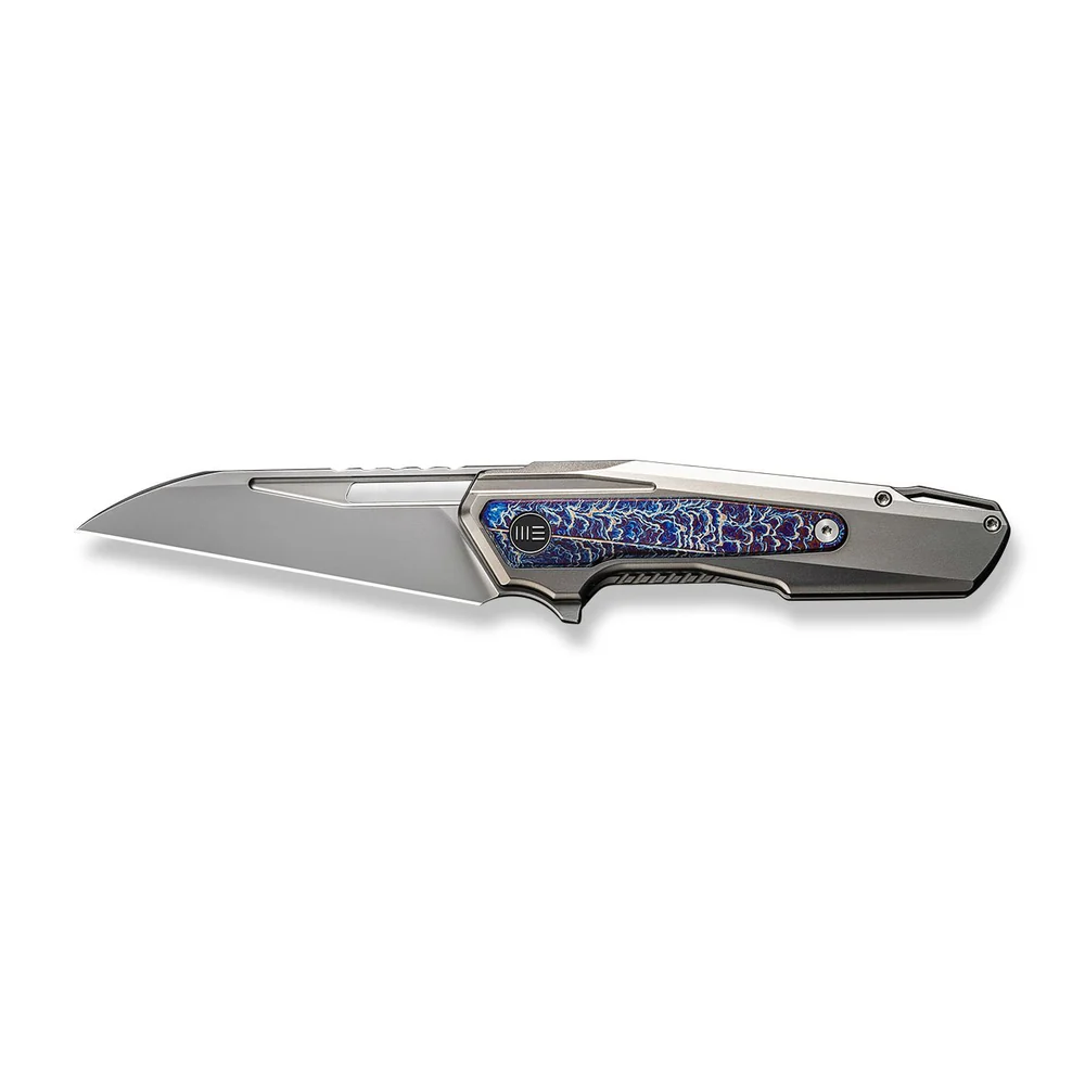 This WE Knife Co., Ltd Falcaria Frame Lock knife utilizes a 3 5/8" Locking Wharncliffe blade with a plain edge, 3.2mm (0.13") thickness, finger choil, thumb hole, spine jimping, and a finger lever/guard. The blade material is CPM 20CV Stainless Steel (59-61HRC) with a Polished Bead Blasted finish. The contoured handle is Polished Bead Blasted & Flamed 6AL4V Titanium with a nested frame lock, lanyard hole, and a right-carry tip-up pocket clip. It's around 5 1/4 inches long (folded/closed) and weighs approximately 5.2 ounces.
