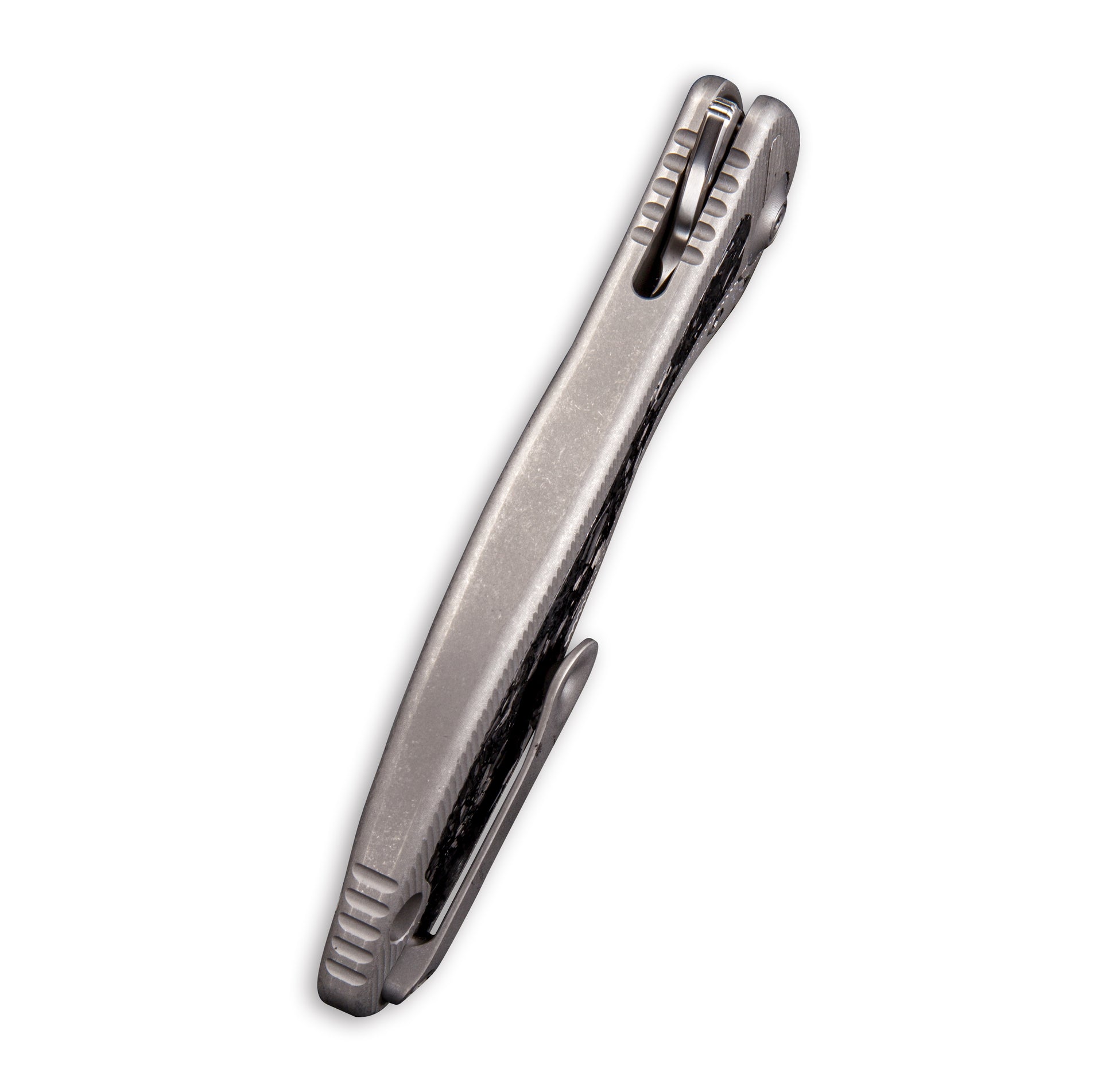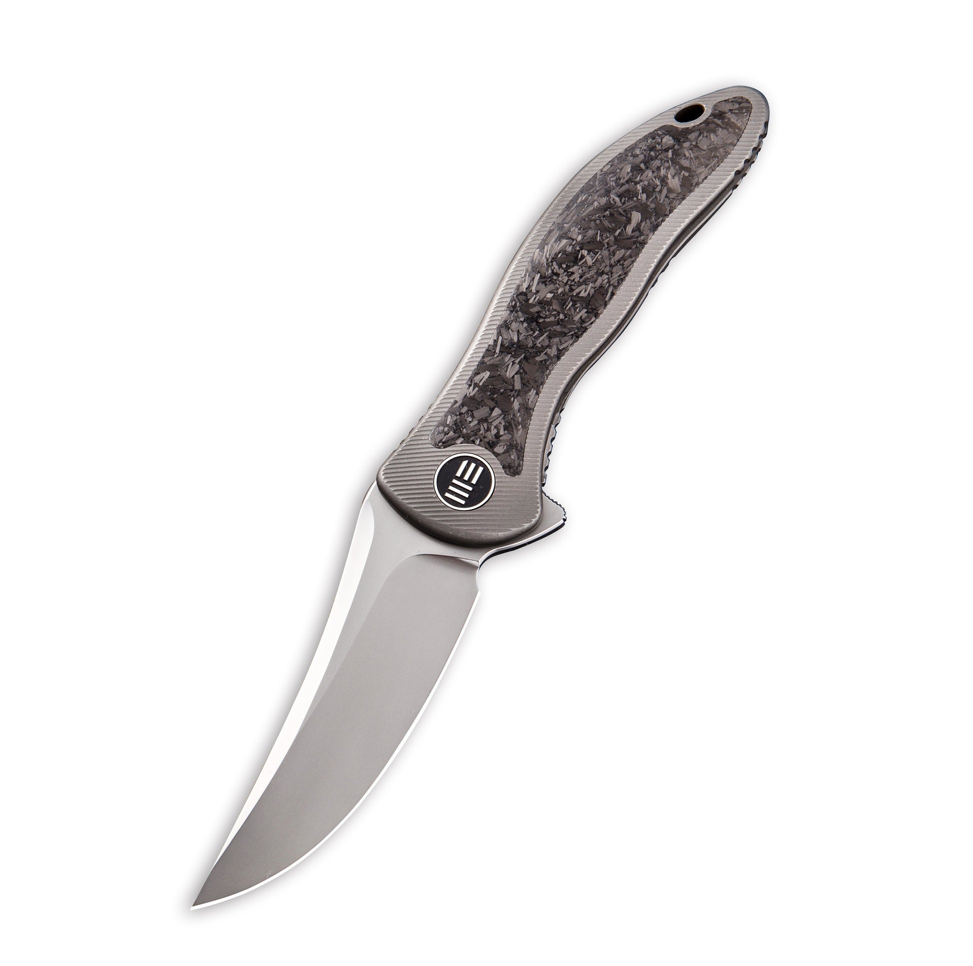 This WE Knife Co., Ltd Synergy2 Frame Lock knife utilizes a 3 1/2" Locking Trailing Point blade with hollow primary grind, flat Tanto grind and a finger lever. The blade material is Bohler M390 Stainless Steel with a satin finish. The textured handle is Shredded Carbon Fiber and Gray 6AL4V Titanium with a lanyard hole and right-carry, tip-up Titanium pocket clip. It's around 4 3/4 inches long (folded/closed) and weighs approximately 4.2 ounces. Handcrafted in China, this knife comes complete with Limited Lifetime Manufacturer's Warranty, Storage Pouch and Box.