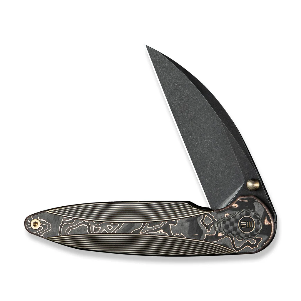 This WE Knife Co., Ltd Zenthra Frame Lock knife utilizes a 3 3/8" Locking Wharncliffe blade with a flat grind, 3.2mm (0.13") thickness, swedge, thumb studs and finger lever. The blade material is M390 Stainless Steel (58-60HRC) with a Black Stonewashed finish. The handle is Black Anodized 6AL4V Titanium and Copper Foil Carbon Fiber with Bronzed hardware and right-carry tip-up Titanium pocket clip. It's around 4 5/8 inches long (folded/closed) and weighs approximately 3.5 ounces. Handcrafted in China, this knife comes complete with Limited Lifetime Manufacturer's Warranty, Storage Pouch and Box.
