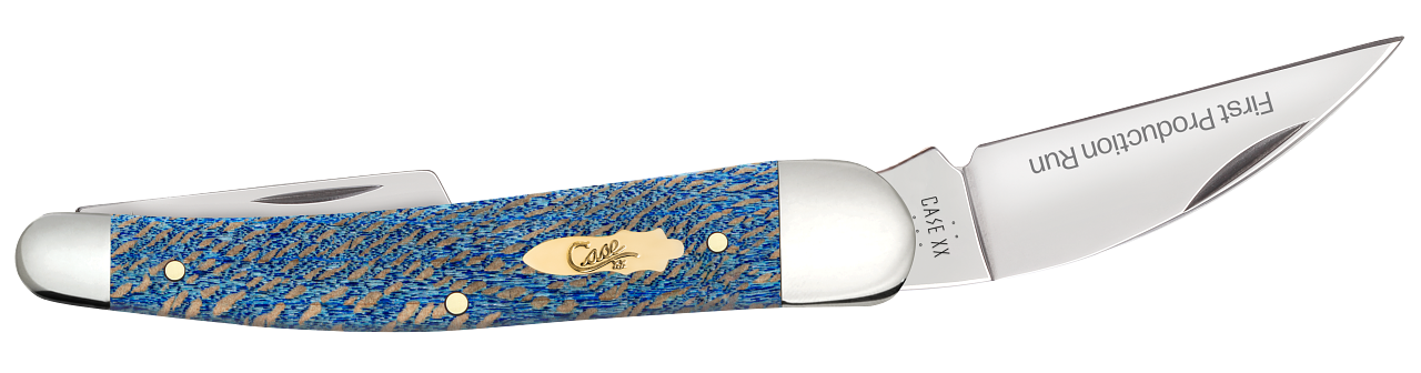 One of only 250 made! This W.R. Case & Sons Cutlery Co. Seahorse Whittler knife utilizes a 2 1/4" Wharncliffe blade, 1 1/2" Coping blade and 1 1/2" Pen blade. Stamped with pattern number 7355WH SS, the blade material is Tru-Sharp Surgical Stainless Steel with a mirror-polished finish and etched with 'First Production Run'. The handle is smooth Blue Sycamore Wood with a Brass Bombshell Script Inlay shield. The bolsters are Highly polished Nickel Silver. It's around 4 inches long (folded/closed) and weighs approximately 2.4 ounces.