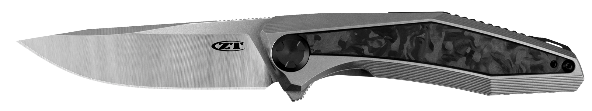 This Zero Tolerance Knives 0470 Frame Lock knife utilizes a 3 1/2" Clip Point blade with a plain edge, swedge, spine jimping, and finger lever. The blade material is CPM-20CV Stainless Steel with satin finish. The handle is marbled Carbon fiber and Titanium with revisible pocket clip. It's around 4 1/2 inches long (folded/closed) and weighs approximately 3.3 ounces.