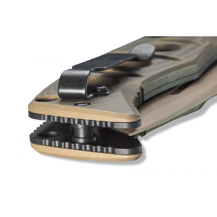 This Benchmade, Inc. Auto Adamas knife utilizes a 3 3/4" Locking Drop Point blade with a partially serrated edge, swedge, spine jimping, 3.6mm (0.14") thickness, and thumb ramp. The blade material is CPM-CruWear Steel with a Dark Earth finish. The handle is Olive Drab Green G10 with an Axis-lock/release, lanyard hole and reversible tip-up pocket clip. It's around 5 1/4 inches long (folded/closed) and weighs approximately 5.8 ounces. Handcrafted in the U.S.A., this knife comes complete with Limited Lifetime Manufacturer's Warranty, MOLLE Ballistics Nylon Sheath. PayPal is restricted for this product.