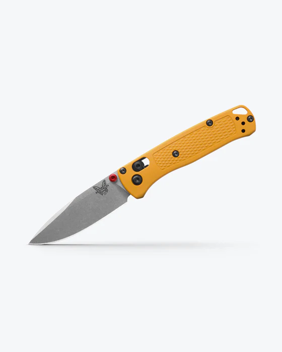 This Benchmade, Inc. Mini Bugout knife utilizes a 2 7/8" Locking Drop Point blade with a plain edge, swedge, 2.3mm (0.09") thickness, and thumb studs. The blade material is CPM S30V Stainless Steel (58-60HRC) with a Stonewashed finish. The contoured handle is textured Daybreak Yellow Grivory with a reversible tip-up...