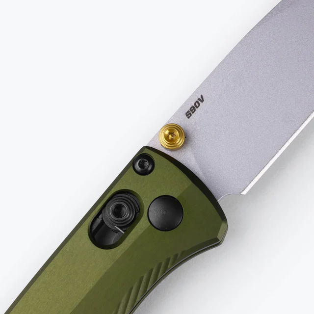 This Benchmade, Inc. Mini Bugout knife utilizes a 2 7/8" Locking Drop-point blade with a plain edge, swedge, 2.3mm thickness, and golden anodized thumb studs. The blade material is CPM-S90V Stainless Steel (59-61HRC) with Crushed Silver Cerakote coating. The handle is smooth Woodland Green Anodized 6061-T6 Aluminum with Black Axis lock, lanyard hole and reversible tip-up pocket clip. It's around 3 3/4 inches long (folded/closed) and weighs approximately 2.0 ounces....