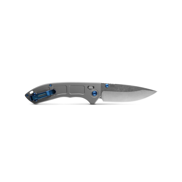 This Benchmade, Inc. Narrows knife utilizes a 3 1/2" Locking Drop Point blade with a plain edge, 2mm thickness and thumb studs. The blade material is Bohler M390 Stainless Steel with a Satin finish. The super-slim handle is 6AL4V Titanium with a blue reversible tip-up pocket clip, Axis lock and lanyard hole. It's around 4 5/8 inches long (folded/closed) and weighs approximately 2.4 ounces. Handcrafted in the U.S.A., this knife comes complete with Limited Lifetime Manufacturer's Warranty, a Storage Pouch.