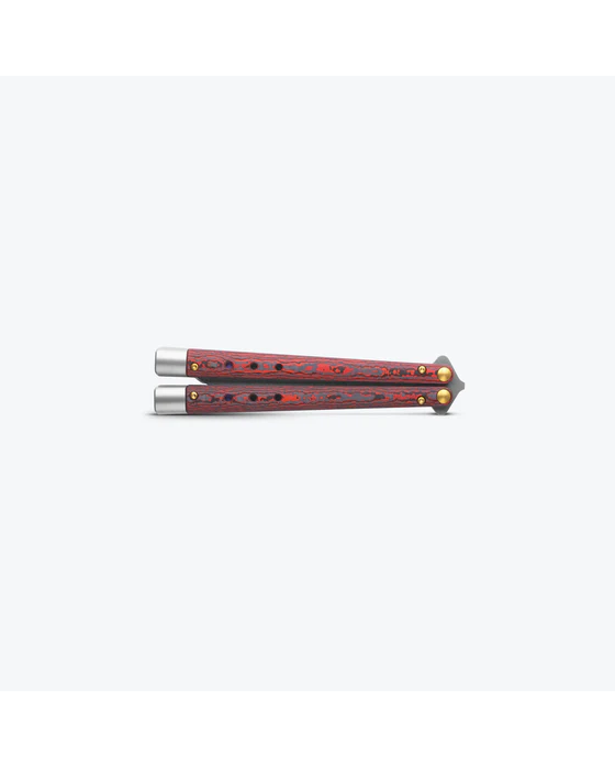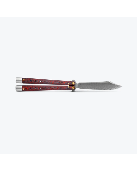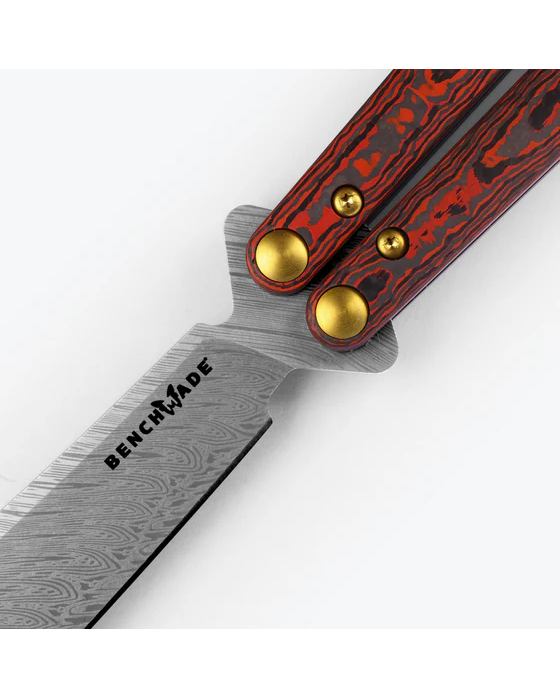 One of only 500 made! This Benchmade, Inc. Necron Bali-Song knife utilizes a 4 5/8" Scimitar blade with a plain edge, swedge, and 3.2mm (0.12") thickness. The blade material is Damasteel (58-60HRC) with WeeHawk pattern. The handle is textured Lava Flow Red Fat Carbon with Benchmade's signature latchless design with adjustable weights, brushed titanium handle extensions, and blue anodized titanium liners. It's around 5 3/4 inches long (folded/closed) and weighs approximately 4.8 ounces. This tool is presented with a Black Alligator Leather Sleeve, Interchangeable Titanium Back Spacers, Certificate of Authenticity and Presentation Box. PayPal is restricted for this product.