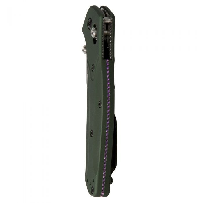 This Benchmade, Inc. Osborne knife utilizes a 3 1/2" Locking Reverse Tanto blade with a plain edge, swedge, 3mm (0.12") thickness, and thumb studs. The blade material is CPM-S30V Stainless Steel with satin finish. The handle is 3D milled, Green Anodized 6061-T6 Aluminum with Axis lock, reversible tip-up pocket clip and purple spacer. It's around 4 1/2 inches long (folded/closed) and weighs approximately 2.9 ounces.