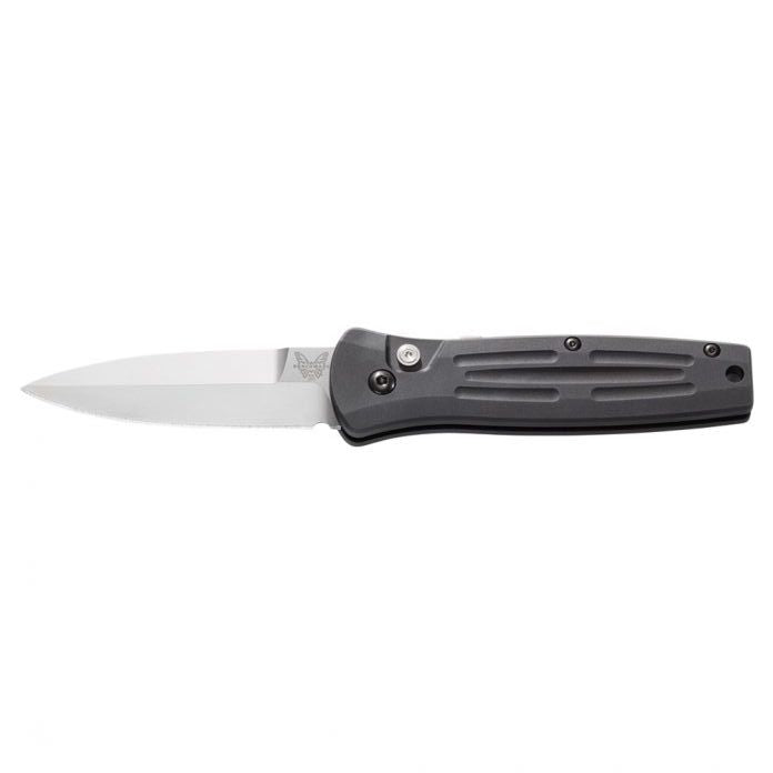 Pardue Design! This Benchmade, Inc. Stimulus knife utilizes a 3" Locking Spear-point blade with a plain edge. The blade material is 154CM Stainless Steel with satin finish. The handle is milled, Black Anodized Aluminum with a lanyard hole, release button, and reversible tip-up pocket clip. It's around 4 1/8 inches long (folded/closed) and weighs approximately 2.7 ounces. PayPal is restricted for this product.