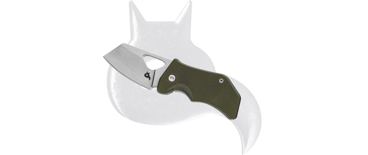 This Black Fox Knives Kit Frame Lock knife utilizes a 2 " Sheepsfoot blade with a plain edge, 3mm thickness and thumb hole. The blade material is 440C Stainless Steel with Stonewashed finish. The contoured handle is Olive Drab Green G10 with a right-carry, tip-up pocket clip/lanyard hole. It's around 2 5/8 inches long (folded/closed) and weighs approximately 2.5 ounces.