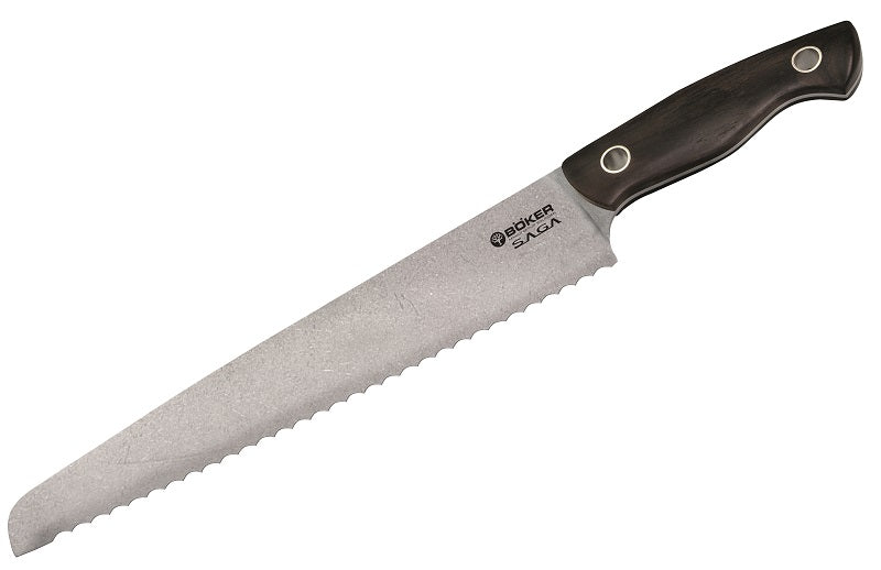 This Böker Saga Knives Bread Knife knife utilizes a 9 1/4" Bread blade. The full tang blade is 440C Stainless Steel with Stonewash finish etched with "Boker Manufaktur Solingen Saga", "130381 440-C", and individual serial number. The handle is high density Grenadill Wood. The large hollow rivets are typical for the designs of Jesper Voxnaes of Denmark. It's around 14 1/8 inches long (total) and weighs approximately 6.9 ounces. Handcrafted in Solingen, Germany, this knife comes complete with Individual Serial Number, Limited Lifetime Manufacturer's Warranty, a Black, Padded Presentation Box with Boker Saga Certificate.