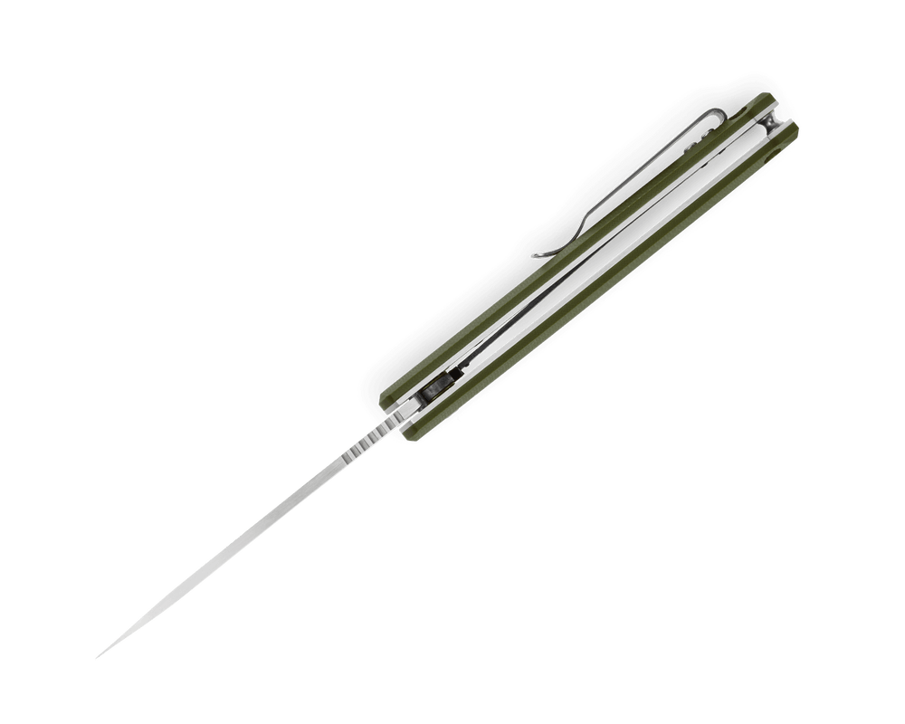 This Buck Knives Langford Liner Lock knife utilizes a 3 3/8" Locking Drop Point blade with a plain edge, spine jimping, 3mm thickness and finger lever. The blade material is 7Cr17MoV Stainless Steel with a Satin finish. The handle is OD Green G10 with a lanyard hole and removable, right-carry tip-up pocket clip. It's around 4 1/2 inches long (folded/closed) and weighs approximately 3.4 ounces.