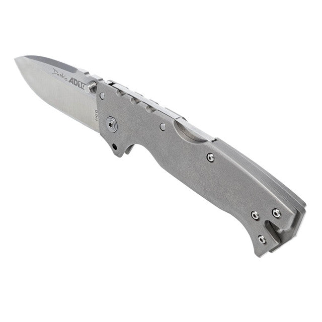 One of only 1000 made!! This Cold Steel, Inc. AD-10 Tri-Ad Lock knife utilizes a 3 1/2" Locking Drop Point blade with a plain edge, swedge, 3.8mm thickness, finger choil and thumb studs. The blade material is 3V Carbon Tool Steel with a satin finish. The handle is Bead-blasted Gray Titanium with a lanyard hole and reversible tip-up pocket clip. It's around 5 1/4 inches long (folded/closed) and weighs approximately 9.0 ounces. This knife comes complete with a Presentation Box and additional Left-carry Pocket Clip.