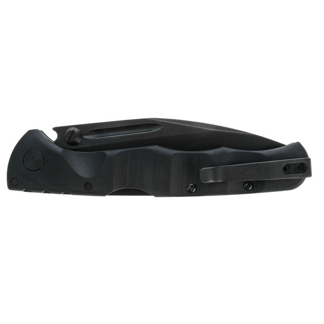 High-strength Tri-Ad Blade Lock! Andrew Demko Design! This Cold Steel, Inc. Frenzy 2 Lockback knife utilizes a 3 1/2" Locking Wharncliffe blade with a plain edge, 3.3mm thickness and thumb studs aided by a reflex spring. The blade material is 3V Carbon Tool Steel with a Black DLC finish. (Note: Tool Steel is generally harder than stainless steel, this allows the blade to hold a sharper edge, longer. However, Carbon Steel will corrode/rust if it's not cleaned and oiled regularly.) The textured handle is milled Black G10 with a lanyard hole and reversible, tip-up pocket clip. It's around 4 1/2 inches long (folded/closed) and weighs approximately 2.6 ounces.