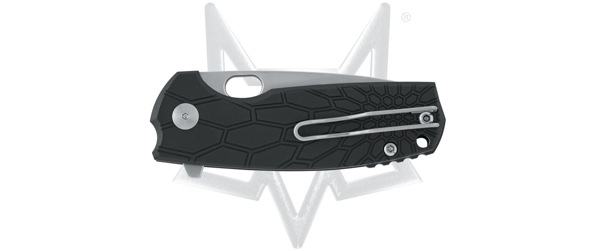This Fox Knives Core Liner Lock knife utilizes a 3 1/8" Locking Drop Point blade with a plain edge, 4mm thickness, thumb hole and finger lever. The blade material is N690Co Stainless Steel with a Stonewashed finish. The engraved handle is Black FRN (Fiber Reinforced Nylon) with a lanyard hole and reversible tip-up pocket clip. It's around 4 3/8 inches long (folded/closed) and weighs approximately 4.8 ounces.