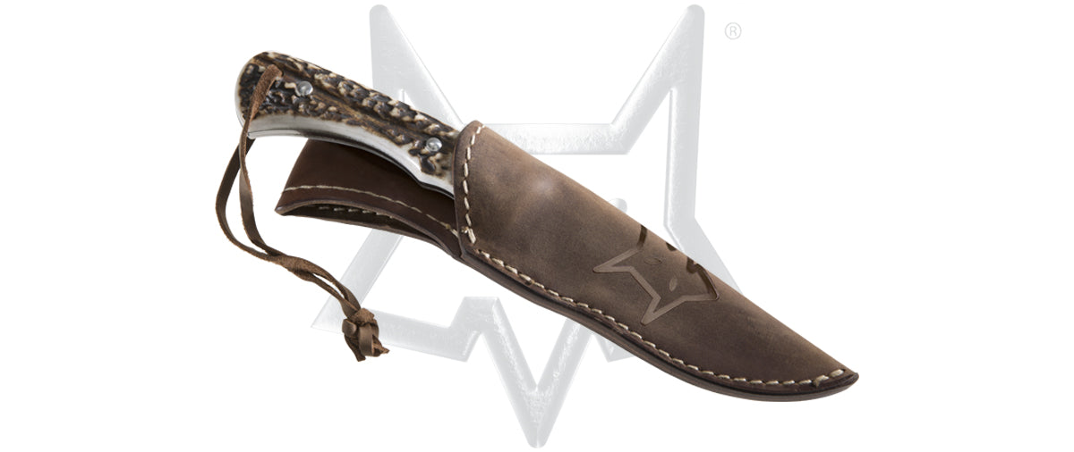 This Fox Knives European Hunter Fixed Blade knife utilizes a 2 7/8" Drop Point blade with a plain edge and 3mm(0.12") thickness. The blade material is 440C Stainless Steel with a Satin finish. The contoured handle is textured Deer Stag with a lanyard hole. It's around 7 1/2 inches long (total) and weighs approximately 3.9 ounces. Handcrafted in Italy, this knife comes complete with Limited Lifetime Manufacturer's Warranty, a Leather Belt Sheath.