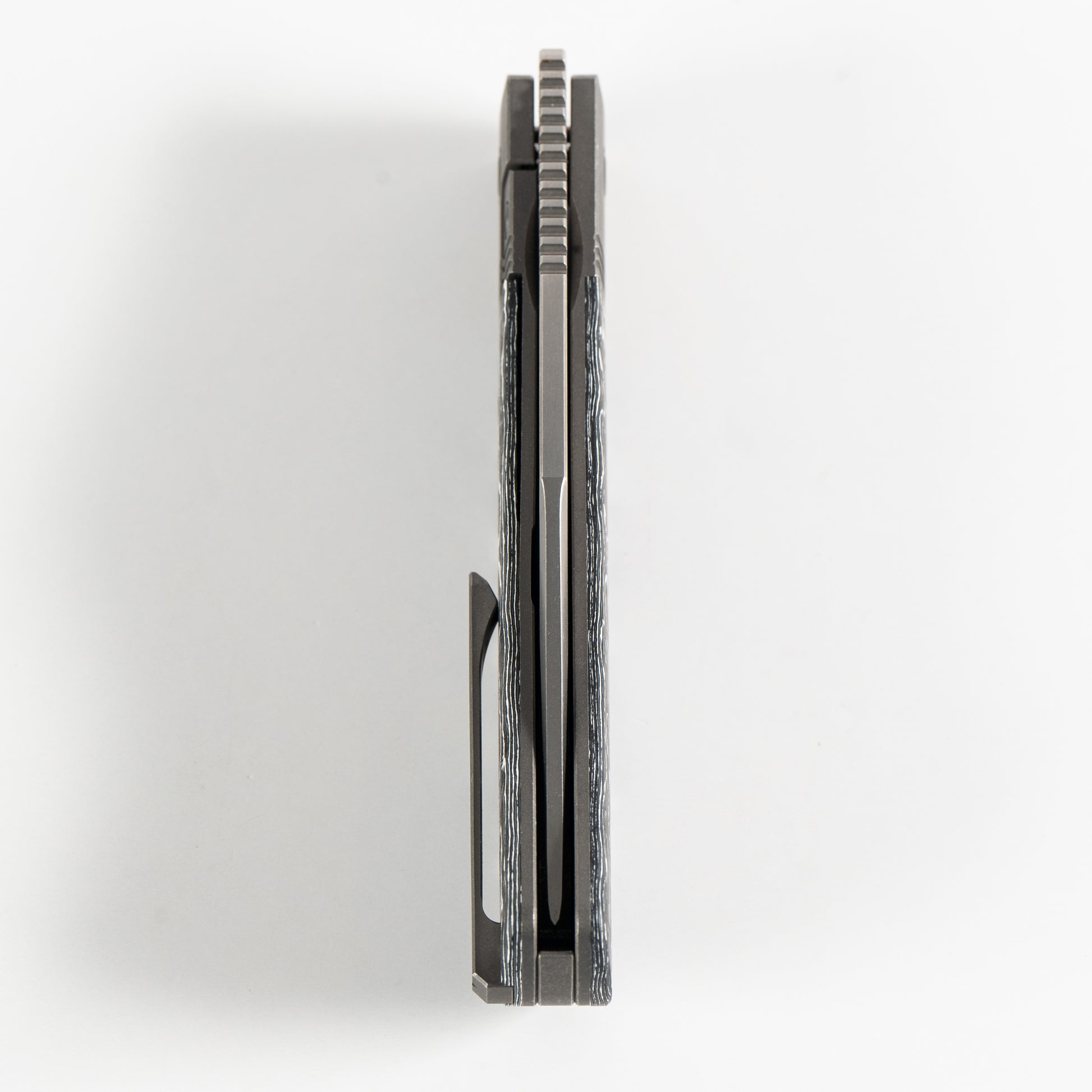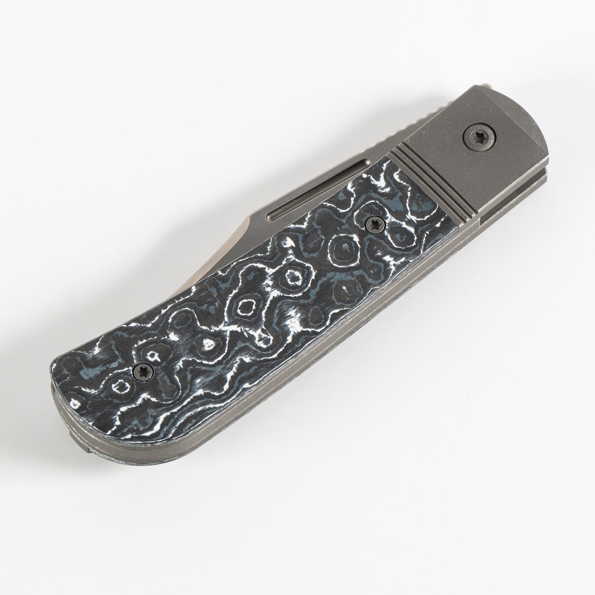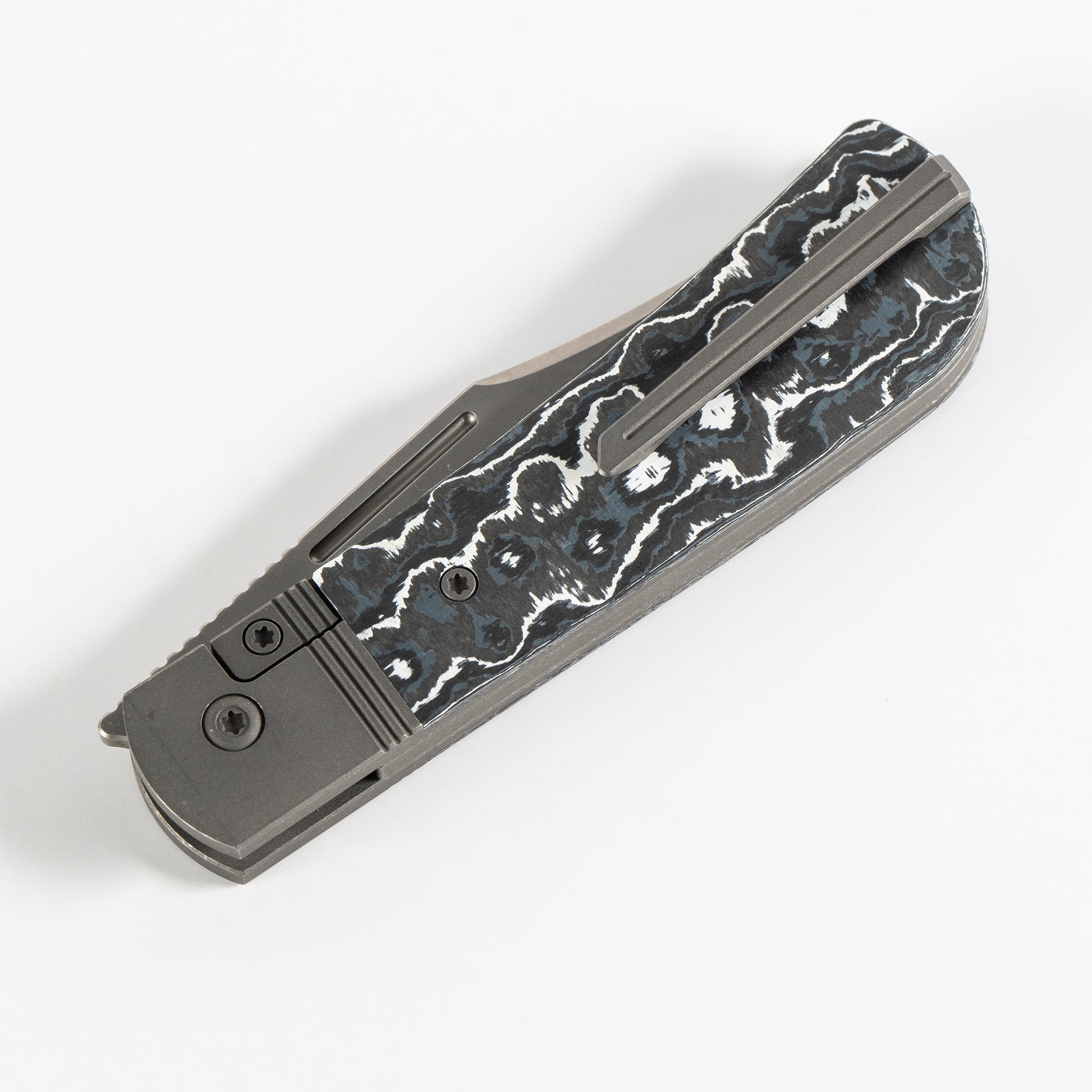 This Jack Wolf Knives The Benny Frame Lock knife utilizes a 3 1/4" Locking Clip Point blade with a hollow grind, 3mm (0.12") thickness and finger lever. The blade material is S90V Stainless Steel (60-61HRC) with a Stonewashed finish. The handle is White Storm Fat Carbon Fiber with Titanium bolsters/liners, and right-carry tip-up Titanium pocket clip. The intergral bolsters are Dark Blasted & Tumbled 6AL4V Titanium. It's around 4 3/8 inches long (folded/closed) and weighs approximately 3.5 ounces. Handcrafted in China, this knife comes complete with Limited Lifetime Manufacturer's Warranty, Pocket Clip Recess Plug and Collector's Tin.