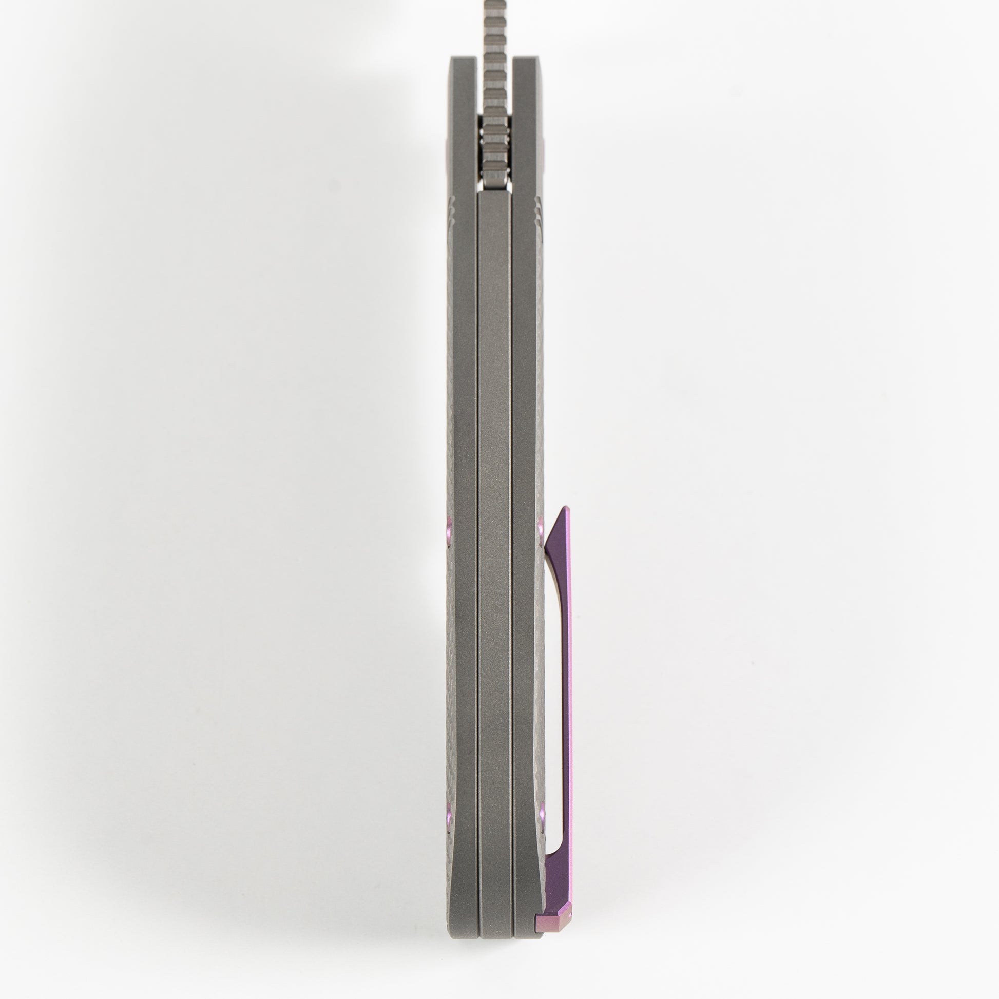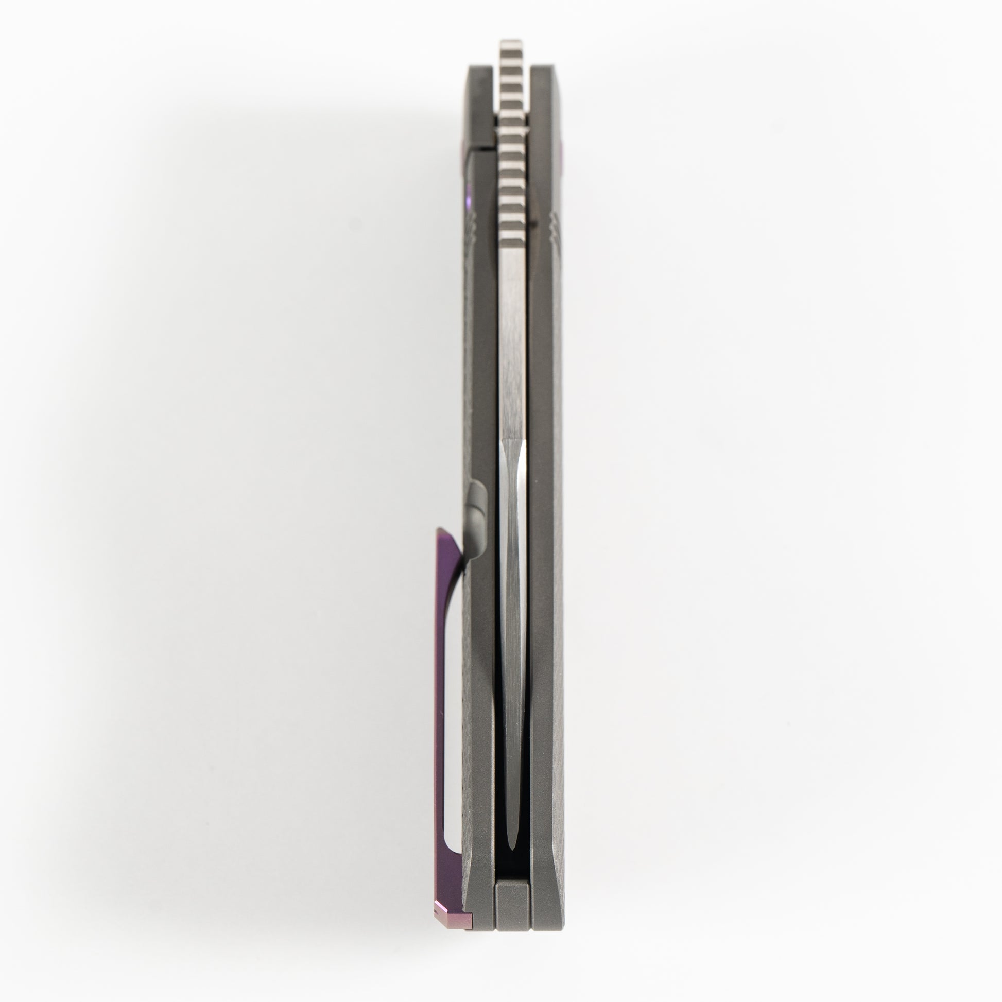 This Jack Wolf Knives The Benny Frame Lock knife utilizes a 3 1/4" Locking Clip Point blade with a hollow grind, 3mm (0.12") thickness and finger lever. The blade material is S90V Stainless Steel (60-61HRC) with a Satin finish. The handle is cross-hatch textured Dark Blasted 6AL4V Titanium with Titanium bolsters/liners, and right-carry tip-up Titanium pocket clip. The intergral bolsters are Dark Blasted & Tumbled 6AL4V Titanium. It's around 4 3/8 inches long (folded/closed) and weighs approximately 3.9 ounces. Handcrafted in China, this knife comes complete with Limited Lifetime Manufacturer's Warranty, Pocket Clip Recess Plug and Collector's Tin.