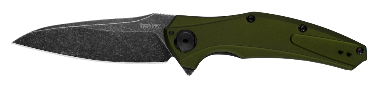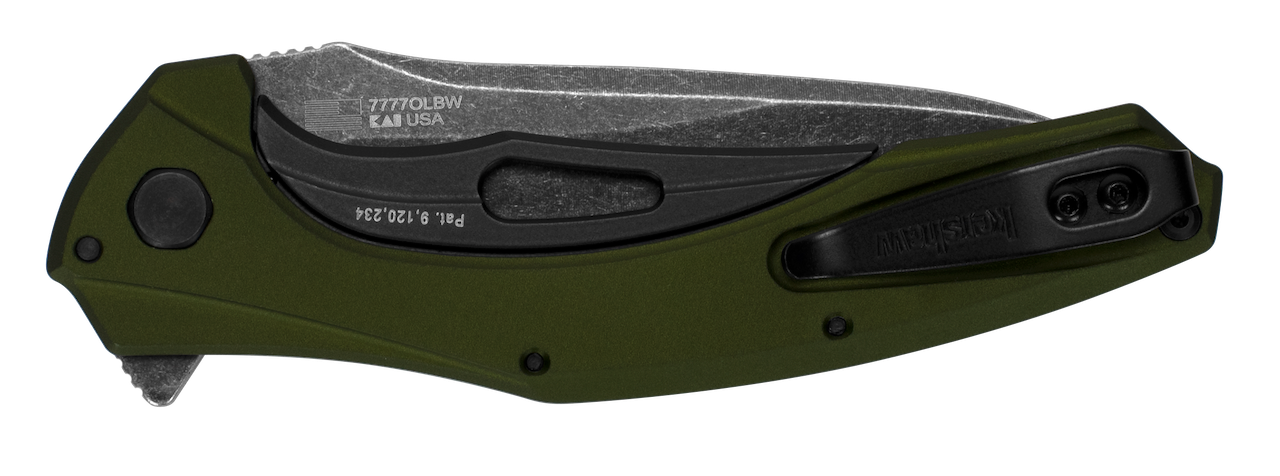This Kershaw Knives B-Knuckle Sub-Frame Lock knife utilizes a 3 5/8" Locking Curved Wharncliffe(w/ Finger Lever) blade. The blade material is Sandvik 14C28N Stainless Steel with stonewashed finish. The handle is Olive anodized 6061-T6 Aluminum with reversible pocket clip. It's around 4 3/4 inches long (folded/closed) and weighs approximately 3.6 ounces.