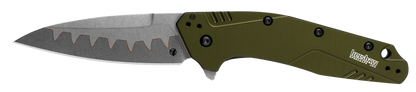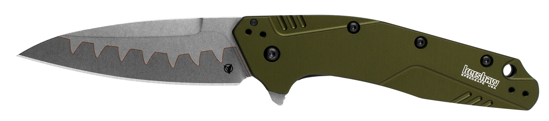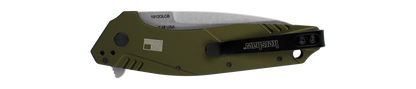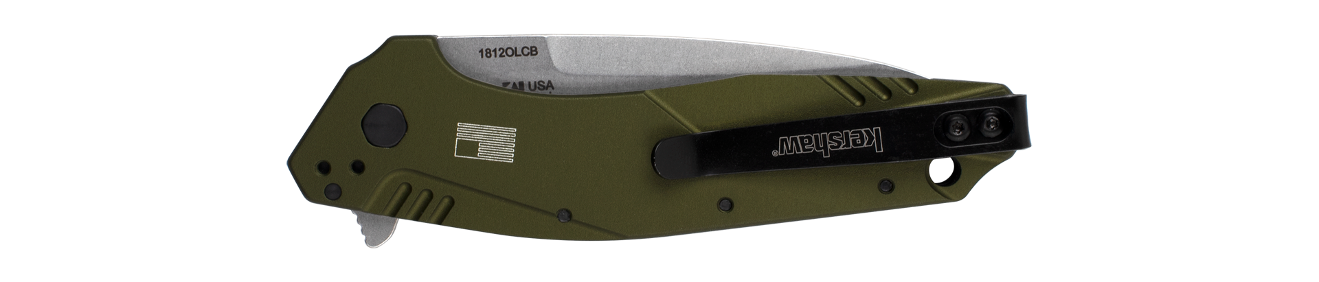 This Kershaw Knives Dividend Liner Lock knife utilizes a 3 1/4" Locking Drop Point(w/ Finger Lever) blade. The blade material is a composite of CPM D2 Steel at the cutting edge, and Bohler N690 Steel at the spine. The handle is machined Olive Green Anodized Aluminum with 4-Position Pocket Clip and Lanyard Hole. It's around 4 1/4 inches long (folded/closed) and weighs approximately 2.8 ounces.