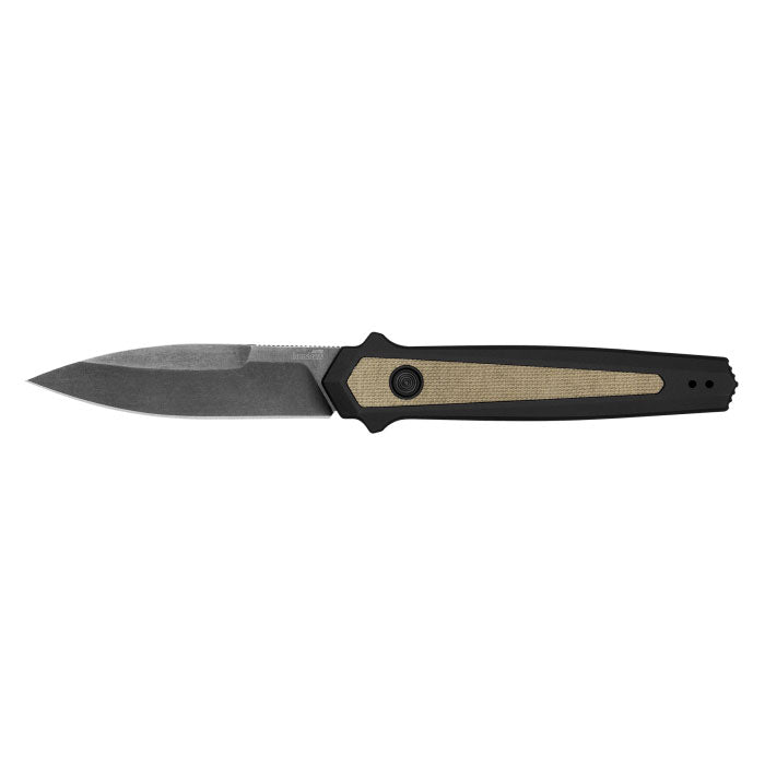 This Kershaw Knives Launch 15 Auto knife utilizes a 3 1/2" Locking Spear blade with a plain edge, 3mm thickness and spine jimping. The blade material is CPM MagnaCut Stainless Steel with Black Stonewash finish. The handle is Black Aluminum and Tan Canvas Micarta with a reversible tip-up pocket clip and release button. It's around 5 inches long (folded/closed) and weighs approximately 3.1 ounces. PayPal is restricted for this product.