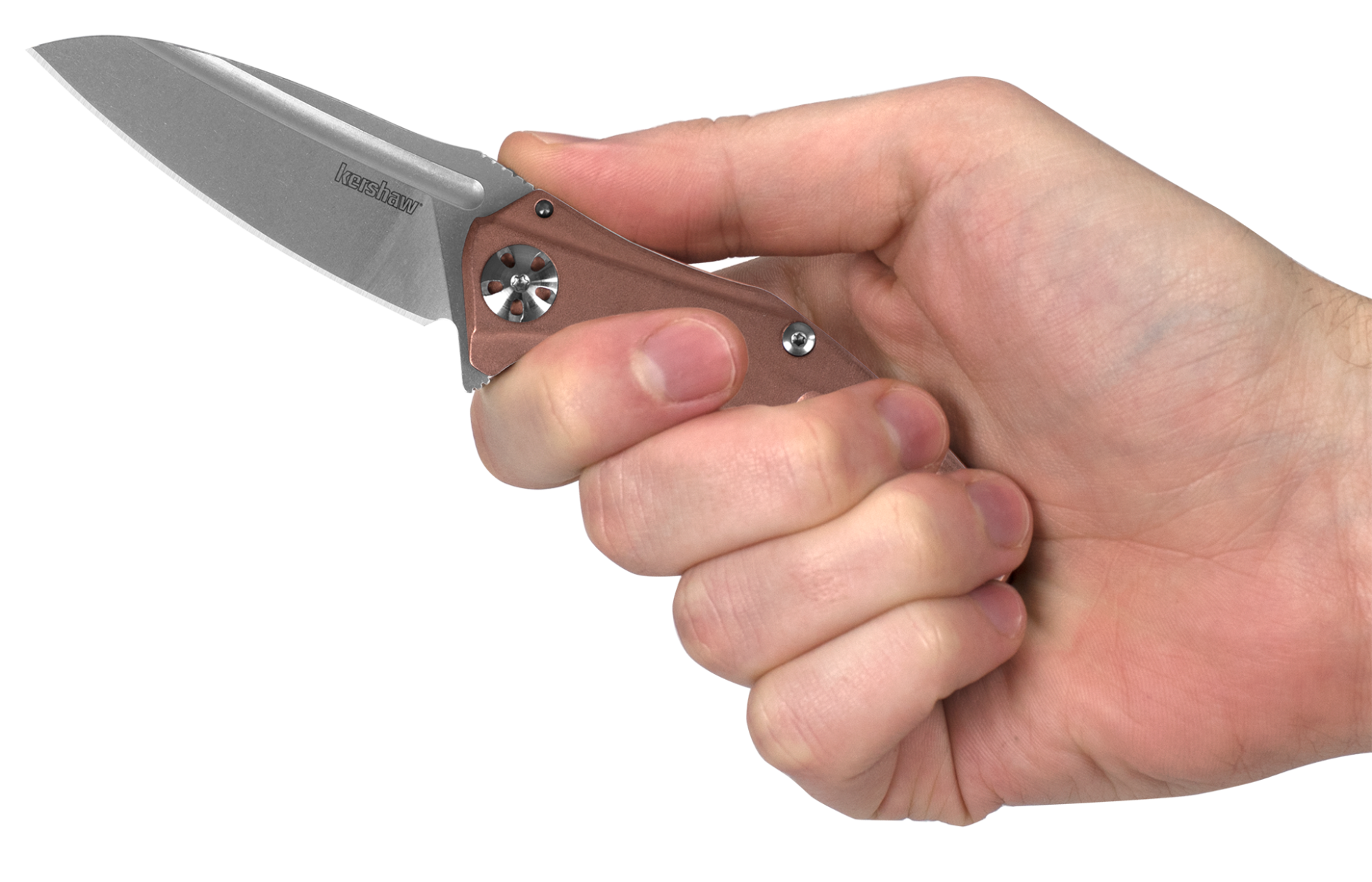 This Kershaw Knives Natrix Frame Lock knife utilizes a 3 1/4" Locking Drop Point(w/ Finger Lever) blade. The blade material is D2 High Carbon Steel with Bead Blasted finish.Note: Carbon Steel is generally harder than stainless steel, this allows the blade to hold a sharper edge, longer. However, Carbon Steel will corrode/rust if it's not cleaned and oiled regularly. The handle is solid Copper with Reversible Pocket Clip. It's around 4 3/8 inches long (folded/closed) and weighs approximately 4.9 ounces.
