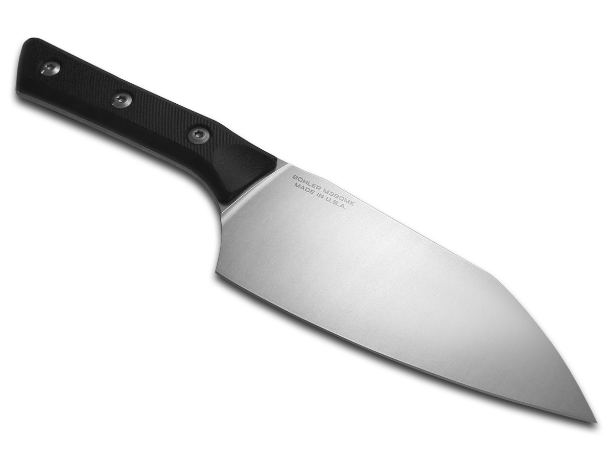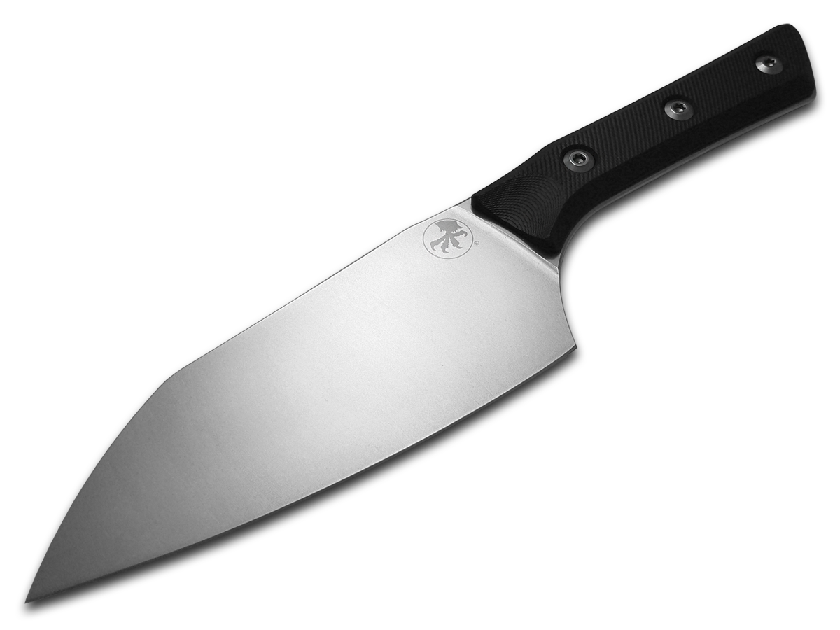 This Microtech Knives, LLC Large Santoku knife utilizes a 6" Sheepsfoot blade with a 2mm (0.08") spine thickness. The blade material is Bohler M390MK Stainless Steel with Stonewashed finish. The contoured handle is textured Black G10 with polished Torx screws. It's around 11 1/2 inches long (total) and weighs approximately 8.2 ounces. Handcrafted in the U.S.A., this knife comes complete with Limited Lifetime Manufacturer's Warranty, a Felt Blade Protector, Polishing Cloth, Knife Care Instructions, and Padded Box.... Read Less