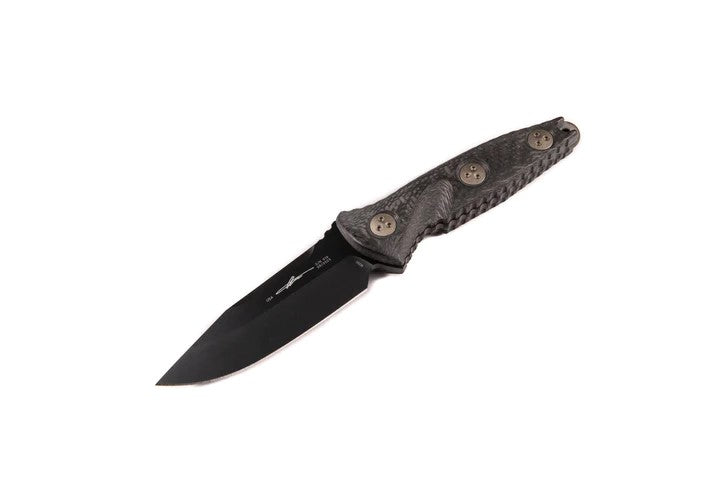 This Microtech Knives, LLC SOCOM Alpha Mini S/E Fixed Blade knife utilizes a 3 3/4" Clip Point blade with a plain edge, 4mm thickness, and spine jimping. The blade material is Bohler M390 Stainless Steel with a Black DLC finish. The handle is Black Carbon Fiber with bronzed hardware, a lanyard hole, thumb ramp, and heavy jimping around the entire full tang. It's around 8 1/2 inches long (total) and weighs approximately 6.0 ounces. Handcrafted in the U.S.A., this knife comes complete with Individual Serial Number, Limited Lifetime Manufacturer's Warranty, a MOLLE-compatible, Multi-position Kydex Sheath with Tek-Lok clip.