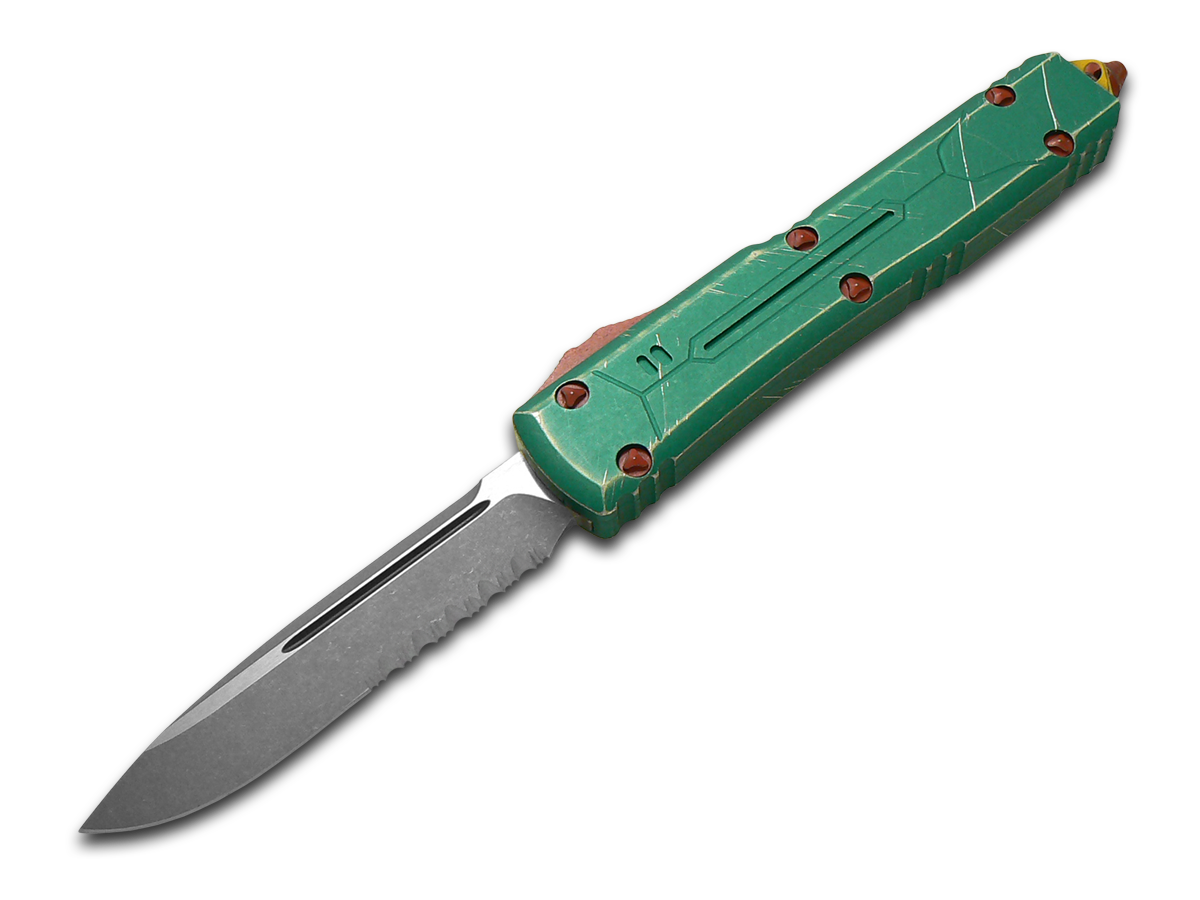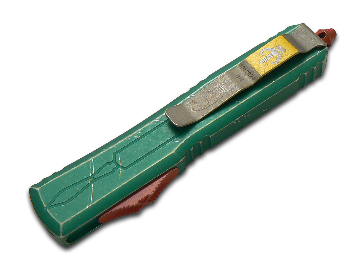 This Microtech Knives, LLC Ultratech S/E OTF knife utilizes a 3 5/8" Drop Point blade with a partially serrated edge, swedge, fuller, and 3mm (0.12") thickness. The blade material is M390MK Stainless Steel with a Stonewashed finish and Satin flats. The handle is Distressed Green Anodized 7075-T6 Aluminum with a 'Bounty Hunter' themed pattern, Red hardware, ambidextrous spine-fired release, glass breaker, lanyard hole and Apocalyptic reversible tip-down pocket clip with the Star Wars' Bounty Hunter insignia. It's around 5 inches long (folded/closed) and weighs approximately 3.3 ounces. PayPal is restricted for this product.