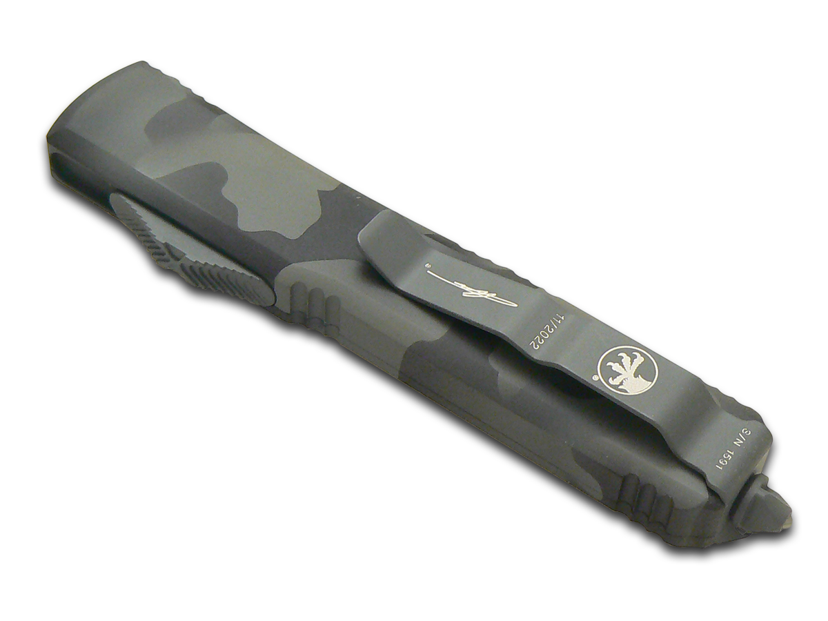 This Microtech Knives, LLC Ultratech S/E OTF knife utilizes a 3 1/2" Locking Drop Point blade with a partially serrated edge, fuller and 3mm thickness. The blade material is Premium Stainless Steel with Urban Camo finish and Satin flats. The handle is smooth Urban Camo anodized 6061-T6 Aluminum with a spine-fired thumb slide, Tungsten Carbide glass-breaker, reversible deep-carry pocket clip, lanyard hole, and jimping for forward & reverse grip. It's around 5 inches long (folded/closed) and weighs approximately 3.4 ounces. PayPal is restricted for this product.