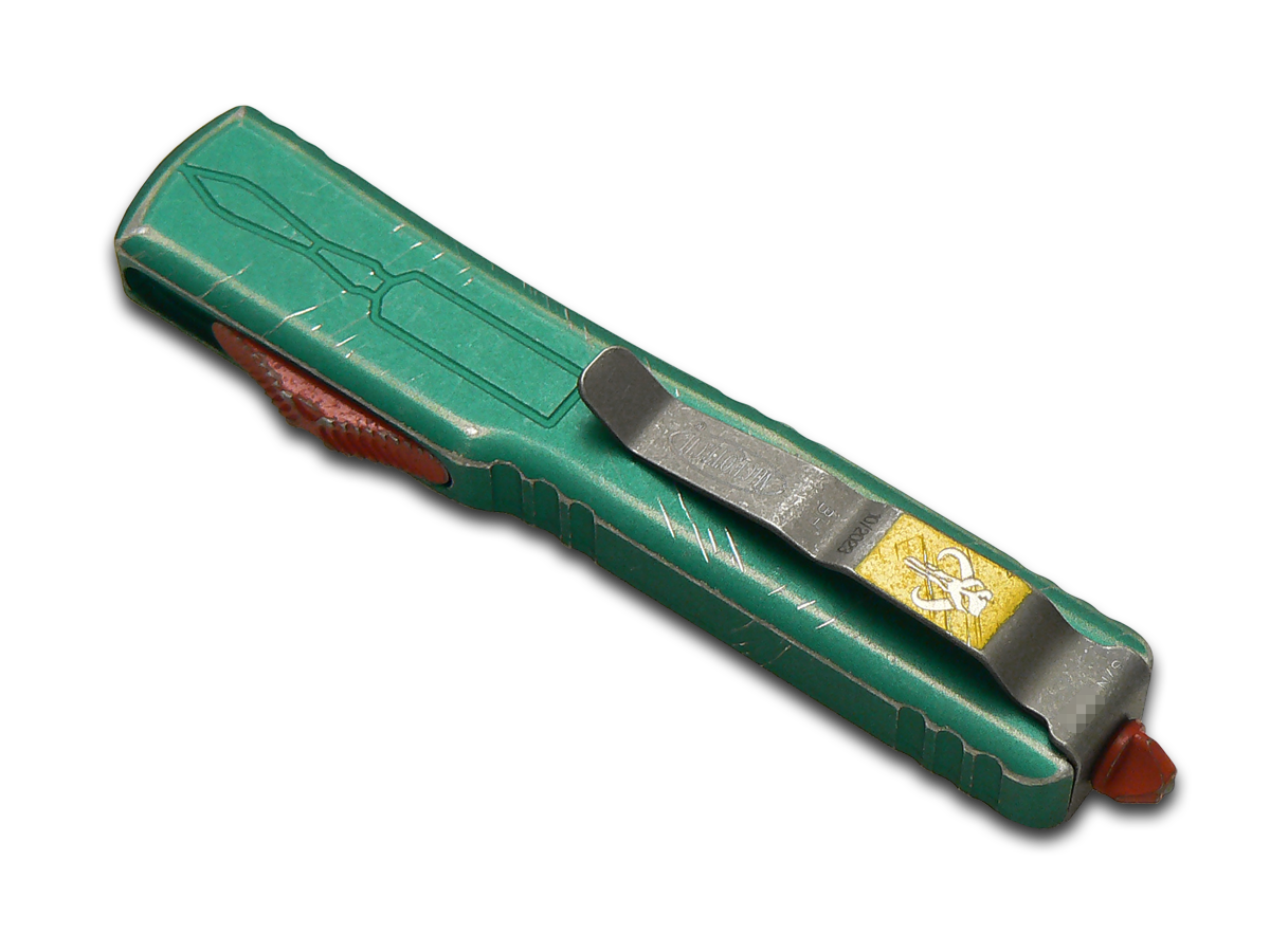 This Microtech Knives, LLC UTX-70 OTF knife utilizes a 2 1/2" Locking Hellhound blade with a plain edge, 2mm (0.08") thickness, fuller milling, and spine jimping. The blade material is Premium Stainless Steel with a Stonewashed finish. The handle is Red & Green Aluminum with jimping, an ambidextrous spine-fired release slider, a glass breaker, and an reversible pocket clip with the Mandalorian sigil. It's around 3 1/2 inches long (folded/closed) and weighs approximately 0.9 ounces. PayPal is restricted for this product.