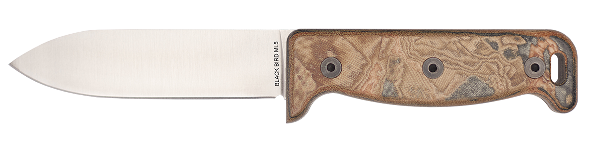 This Ontario Knives Black Bird ML5 Fixed Blade knife utilizes a full-tang, 5" Drop Point blade with a Flat Bevel edge and 3.5mm thickness. The blade material is 420HC Stainless Steel with a Mirror finish. The handle is contured, Multicolor Micarta with finger guard and lanyand hole. It's around 10 inches long (total) and weighs approximately 1 pound(s) 0.0 ounces. Handcrafted in the U.S.A., this knife comes complete with Limited Lifetime Manufacturer's Warranty, a Leather Belt Sheath.