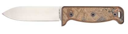 This Ontario Knives Black Bird ML5 Fixed Blade knife utilizes a full-tang, 5" Drop Point blade with a Flat Bevel edge and 3.5mm thickness. The blade material is 420HC Stainless Steel with a Mirror finish. The handle is contured, Multicolor Micarta with finger guard and lanyand hole. It's around 10... Read More