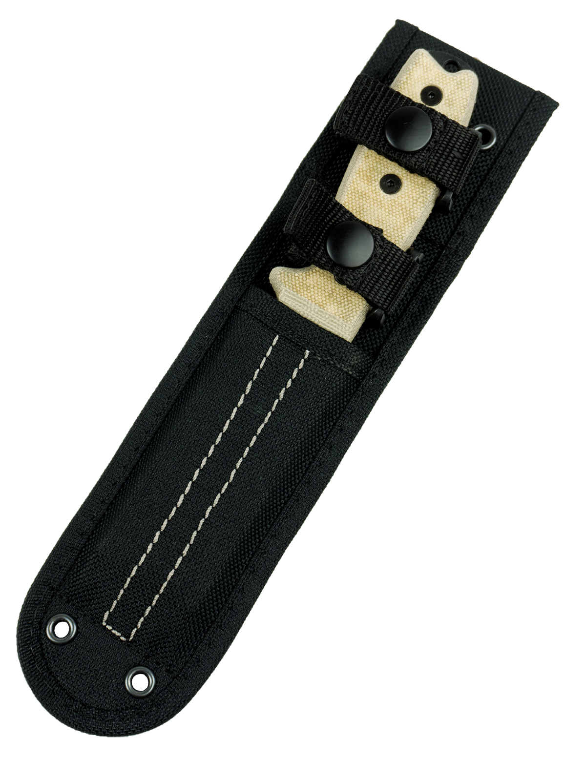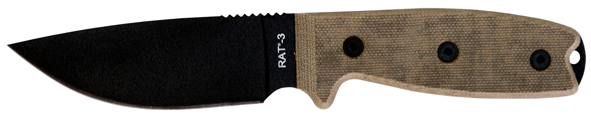 This Ontario Knives RAT-3 Fixed Blade knife utilizes a full-tang, 4" Drop Point blade with a Flat Bevel grind and 3.2mm thickness. The blade material is 1075 Carbon Steel with Black Powder Coat finish.Note: Carbon Steel is generally harder than stainless steel, this allows the blade to hold a sharper edge, longer. However, Carbon Steel will corrode/rust if it's not cleaned and oiled regularly. The handle is contoured, Tan Micarta with finger guard and lanyard hole. It's around 8 inches long (total) and weighs approximately 9.6 ounces. Handcrafted in the U.S.A., this knife comes complete with Limited Lifetime Manufacturer's Warranty, a MOLLE Nylon Sheath.