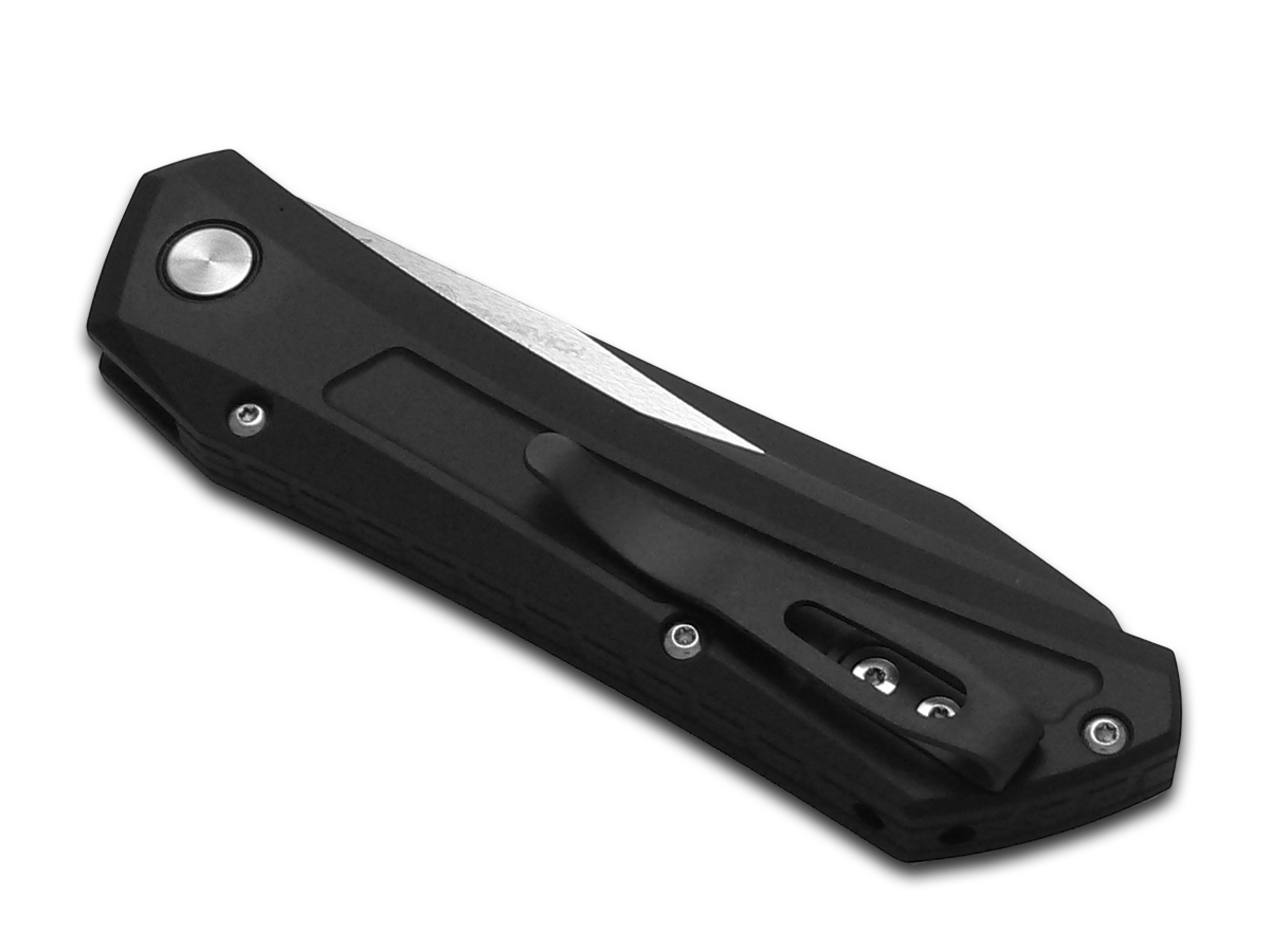 This Pro-Tech Knives, LLC Oligarch Auto knife utilizes a 3 1/4" Locking Reverse Tanto blade with a plain edge, swedge, spine jimping, and 3mm (0.12") thickness. The blade material is MagnaCut Stainless Steel with Black DLC finish and satin flats. The handle is milled Black 6061-T6 Aluminum with tip-up right-carry pocket clip/lanyard hole and Mother-of-Pearl right-hand release button. It's around 4 3/8 inches long (folded/closed) and weighs approximately 2.8 ounces. PayPal is restricted for this product.