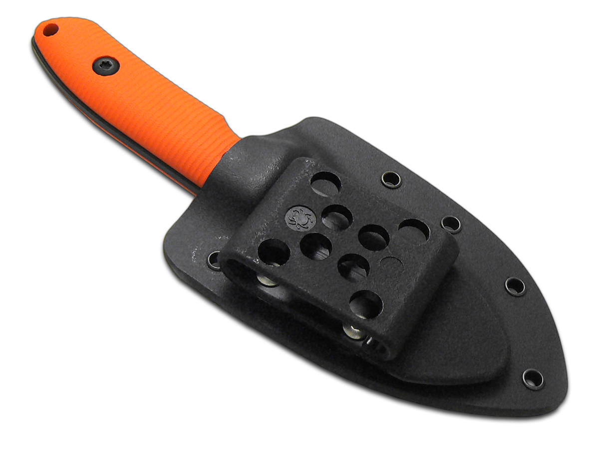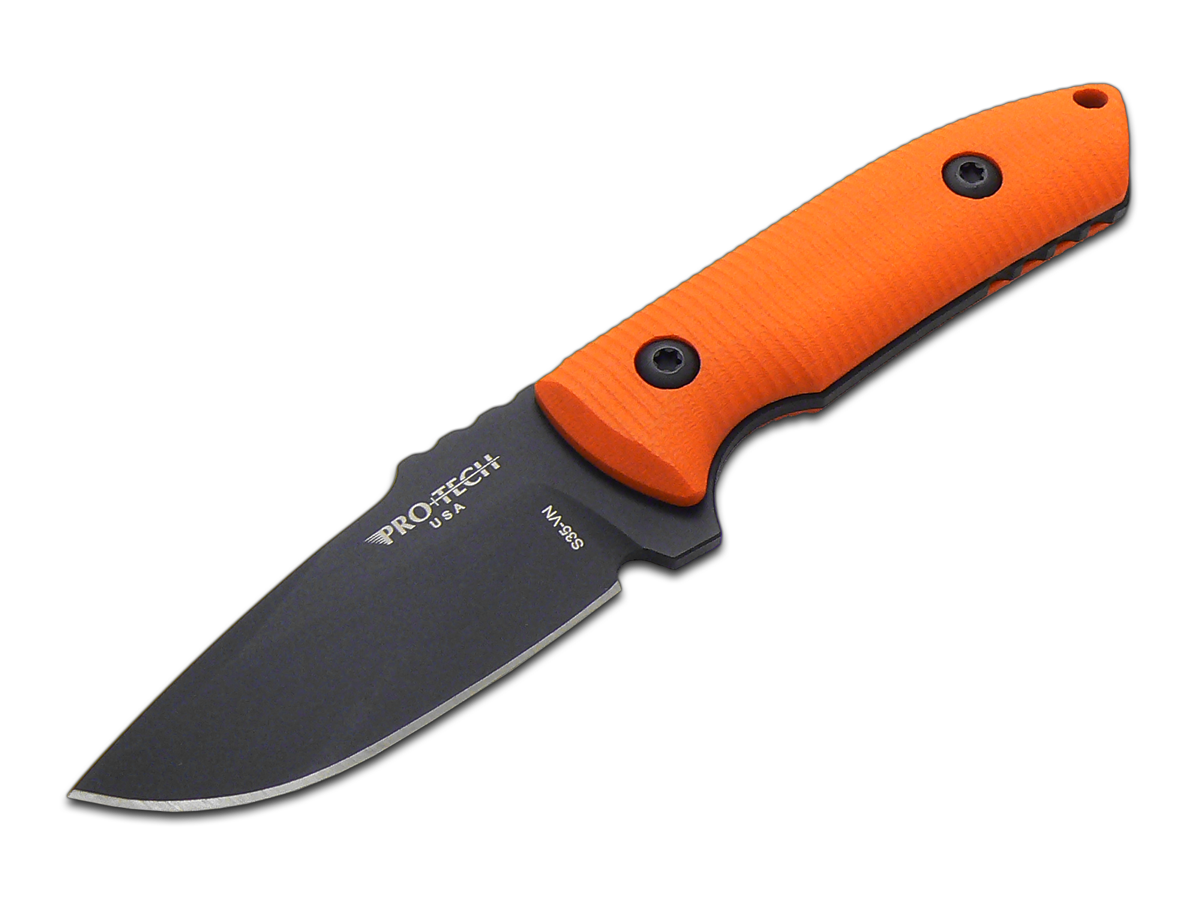 This Pro-Tech Knives, LLC SBR Fixed Blade knife utilizes a 3" Drop Point blade with a plain edge, thumb ramp and 3.2mm thickness. The blade material is CPM S35VN Stainless Steel with Black DLC finish. The handle is contoured and textured Orange G10 with finger guard and lanyard hole. It's around 6 5/8 inches long (total) and weighs approximately 3.7 ounces. Handcrafted in the U.S.A., this knife comes complete with Limited Lifetime Manufacturer's Warranty, a Kydex Sheath.