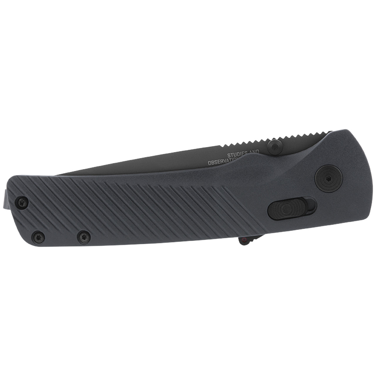 This SOG Specialty Knives Flash AT Lever Lock knife utilizes a 3 1/2" Locking Straight-back blade with a partially serrated edge, spine jimping, 3mm thickness, and thumb studs aided by a reflex spring. The blade material is Cryo D2 Semi-Stainless Steel with cryogenic heat-treatment and a Black Titanium Nitride coating. The handle is textured Urban Grey Glass-Reinforced Nylon with Safety Lock and Reversible Deep-Carry Pocket Clip. It's around 4 3/4 inches long (folded/closed) and weighs approximately 4.5 ounces....