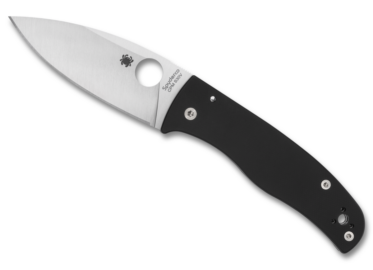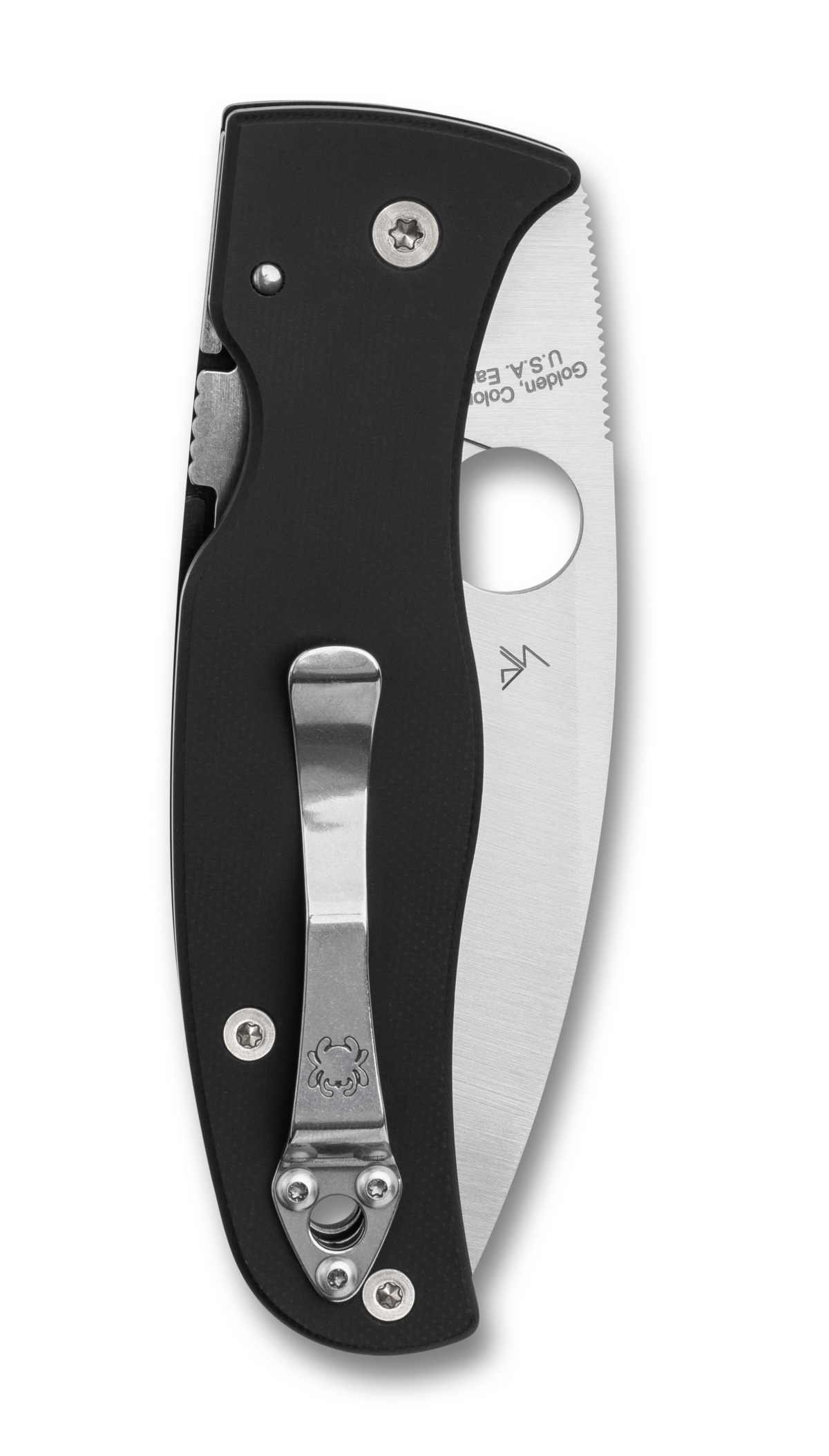 This Spyderco Knives Bodacious Back Lock knife utilizes a 3 5/8" Locking Spear Point blade with a plain edge, full-flat grind, 3.2mm (0.13") thickness, thumb hole, and spine jimping. The blade material is CPM S30V Stainless Steel with a Satin finish. The contoured handle is smooth Black G10 with skeletonized stainless steel liners, a tip-up reversible pocket clip, and lanyard hole. It's around 4 5/8 inches long (folded/closed) and weighs approximately 4.4 ounces.