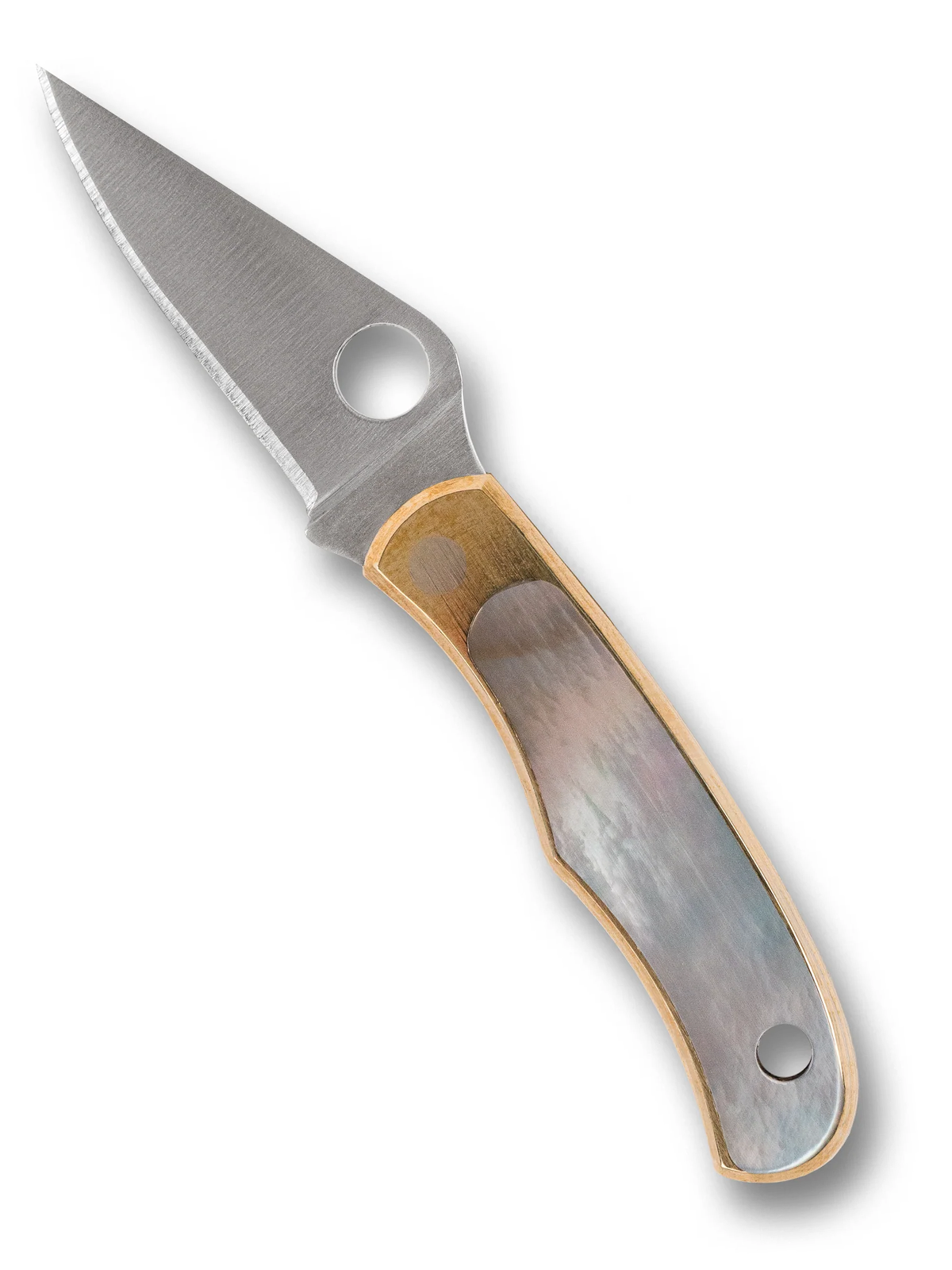 This Spyderco Knives Bug Slip-joint knife utilizes a 1 1/4" Straight-back blade with a plain edge, full-flat grind, 1.8mm thickness, thumb ramp, and thumb hole. The blade material is Sandvik 12C27 Stainless Steel with a satin finish. The handle is genuine Abalone and Nickel Silver with a natural gold-colored tone and lanyard/keychain hole. It's around 1 3/4 inches long (folded/closed) and weighs approximately 0.4 ounces.