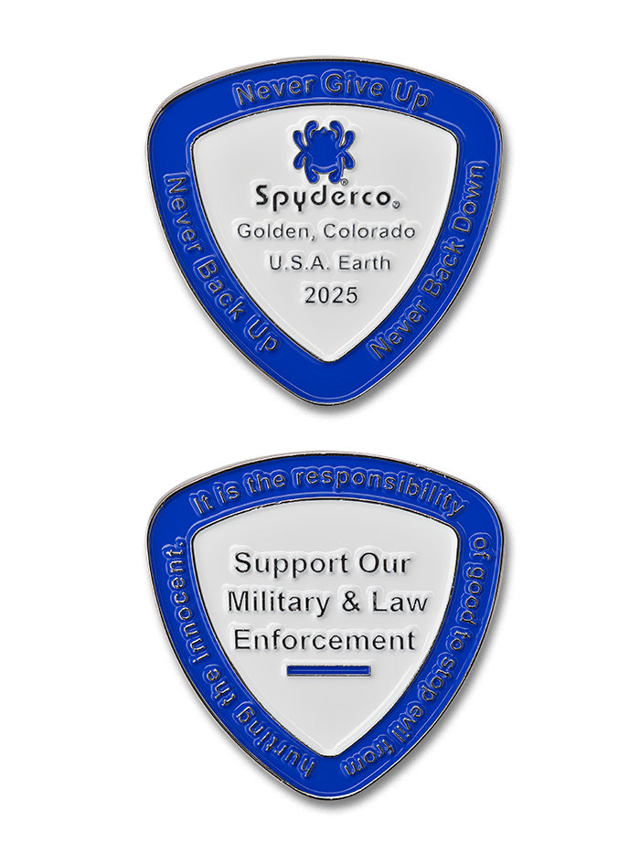 This blue & white Challenge Coin was developed by Spyderco Knives. It is made from high-quality Die Cast Metal and measures 1 3/4"L X 1 3/4"W X 1/8"H. A portion of all sales of all SpyderCoins will be donated to the Tunnel to Towers Foundation (t2t.org), which honors firefighter Stephen Siller's sacrifice of laying down his life to save others on September 11, 2001. Tunnel to Towers operates multiple charitable programs that support first responders and military personnel who have made the supreme sacrifice of life and limb for our country.
