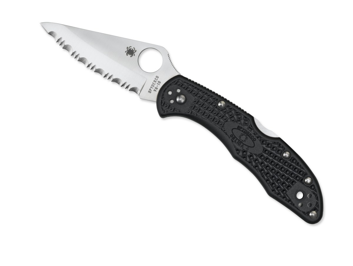 This Spyderco Knives Delica 4 Lockback knife utilizes a serrated 2 7/8" Locking Drop Point(w/Thumb Hole) blade. The blade material is VG-10 Stainless Steel. The handle is lightweight Black Fiberglass Reinforced Nylon with Non-Slip Bi-Directional Texturing, 4-Position Pocket Clip, and Lanyard Hole. It's around 4 1/4 inches long (folded/closed) and weighs approximately 2.5 ounces....