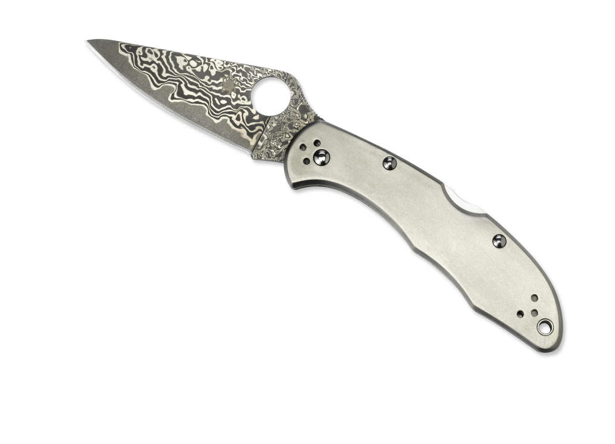 This Spyderco Knives Delica 4 Lockback knife utilizes a 3" Locking Leaf-shaped blade(w/Thumb Hole). The blade material is VG-10 Stainless Steel sandwiched between two outer layers of Damascus steel. The handle is Titanium with 4-position Pocket Clip and Lanyard Hole. It's around 4 1/4 inches long (folded/closed) and weighs approximately 3.0 ounces....