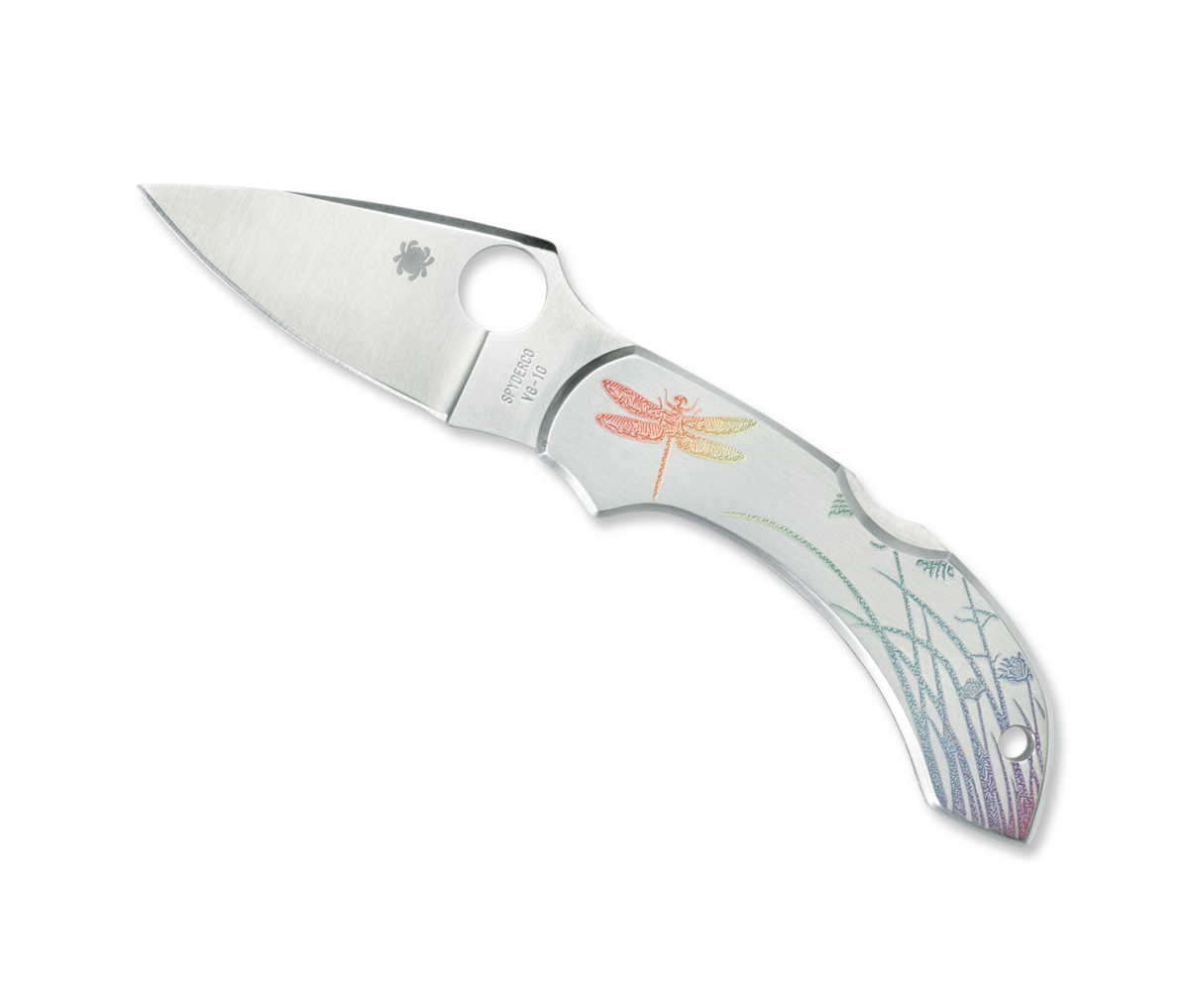 This Spyderco Knives Dragonfly Lockback knife utilizes a 2 3/8" Locking Leaf-Shaped blade(w/Thumb Hole). The blade material is VG-10 Stainless Steel with Brushed finish. The handle is Satin-finish Stainless Steel with Dragonfly etching, Tip-Up Pocket Clip and Lanyard Hole. It's around 3 1/4 inches long (folded/closed) and weighs approximately 2.6 ounces....