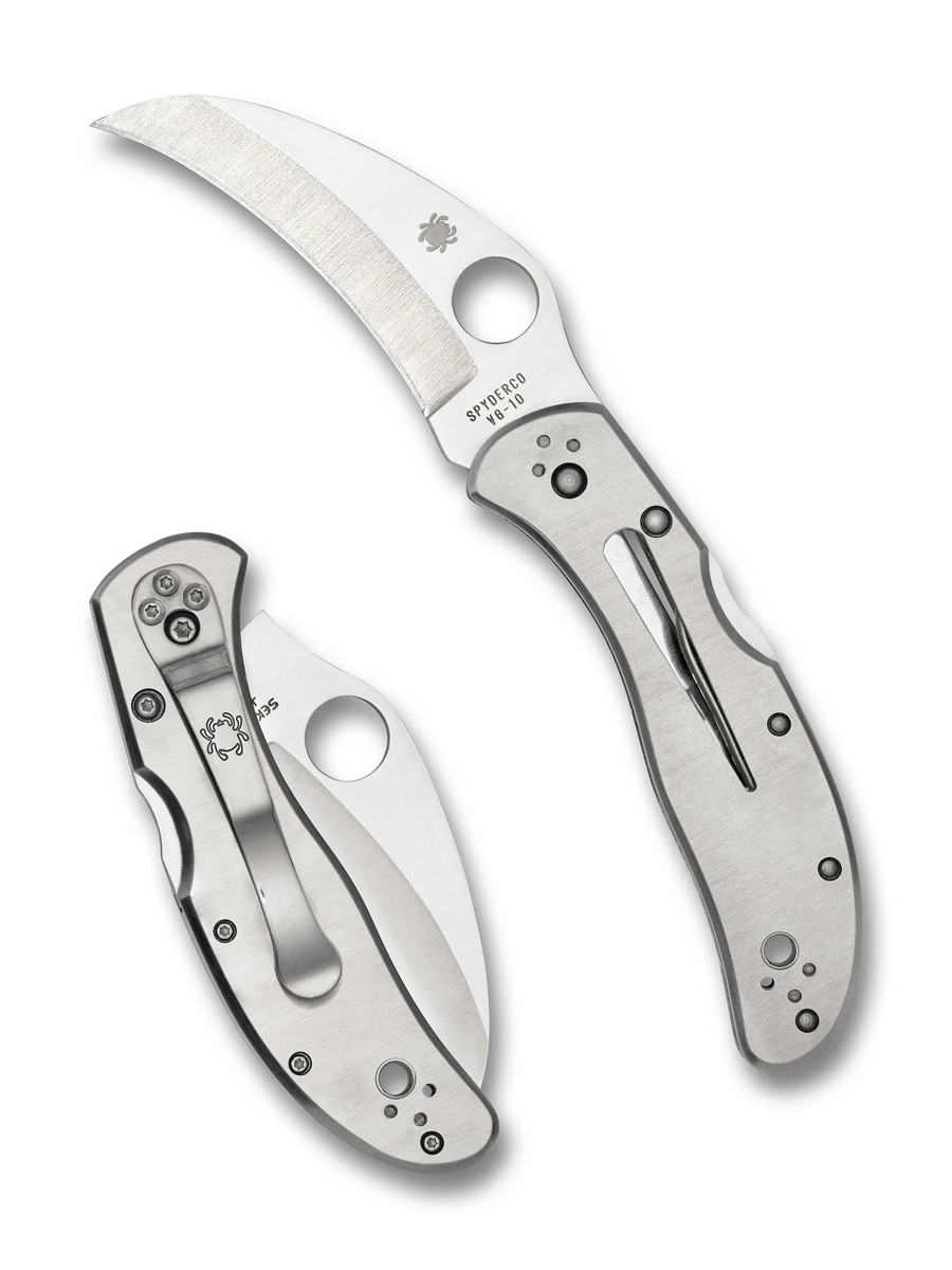 This Spyderco Knives Harpy Lockback knife utilizes a 2 3/4" Hawkbill blade with a plain edge, hollow grind, 3mm thickness, thumb ramp, and thumb hole. The blade material is VG-10 Stainless Steel with a satin finish. The handle is Stainless Steel with a Satin finish, lanyard hole and 4-position pocket clip. It's around 3 7/8 inches long (folded/closed) and weighs approximately 3.8 ounces.