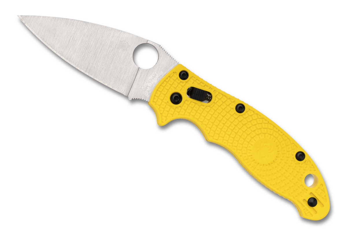 This Spyderco Knives Manix 2 Bearing Lock knife utilizes a 3 3/8" Locking Drop Point blade with a plain edge, Full-flat grind, 3.2mm (0.13") thickness, Thumb hole, Finger guard, Finger Choil, Thumb ramp, and spine jimping. The blade material is CPM-Magnacut Stainless Steel with a Satin finish. The contoured handle is Yellow FRCP with skeletonized stainless steel liners, an ambidextrous Ball Bearing Lock, a tip-up pocket clip, a lanyard hole, and jimping for improved grip in forward or reverse grip. It's around 4 5/8 inches long (folded/closed) and weighs approximately 2.8 ounces.