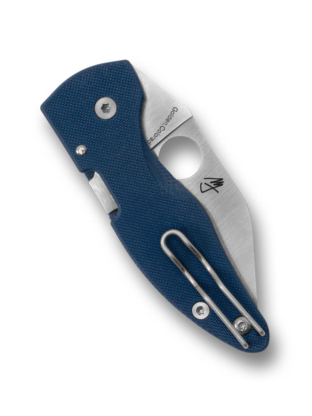 This Spyderco Knives MicroJimbo Compression Lock knife utilizes a 2 1/2" Locking Wharncliffe blade with a plain edge, full-flat grind, 3.7mm thickness, and thumb hole. The blade material is CPM SPY27 Stainless Steel with a Satin finish. The contoured handle is Cobalt Blue G-10 with finger groove and reversible tip-up pocket clip. It's around 3 3/4 inches long (folded/closed) and weighs approximately 2.9 ounces....